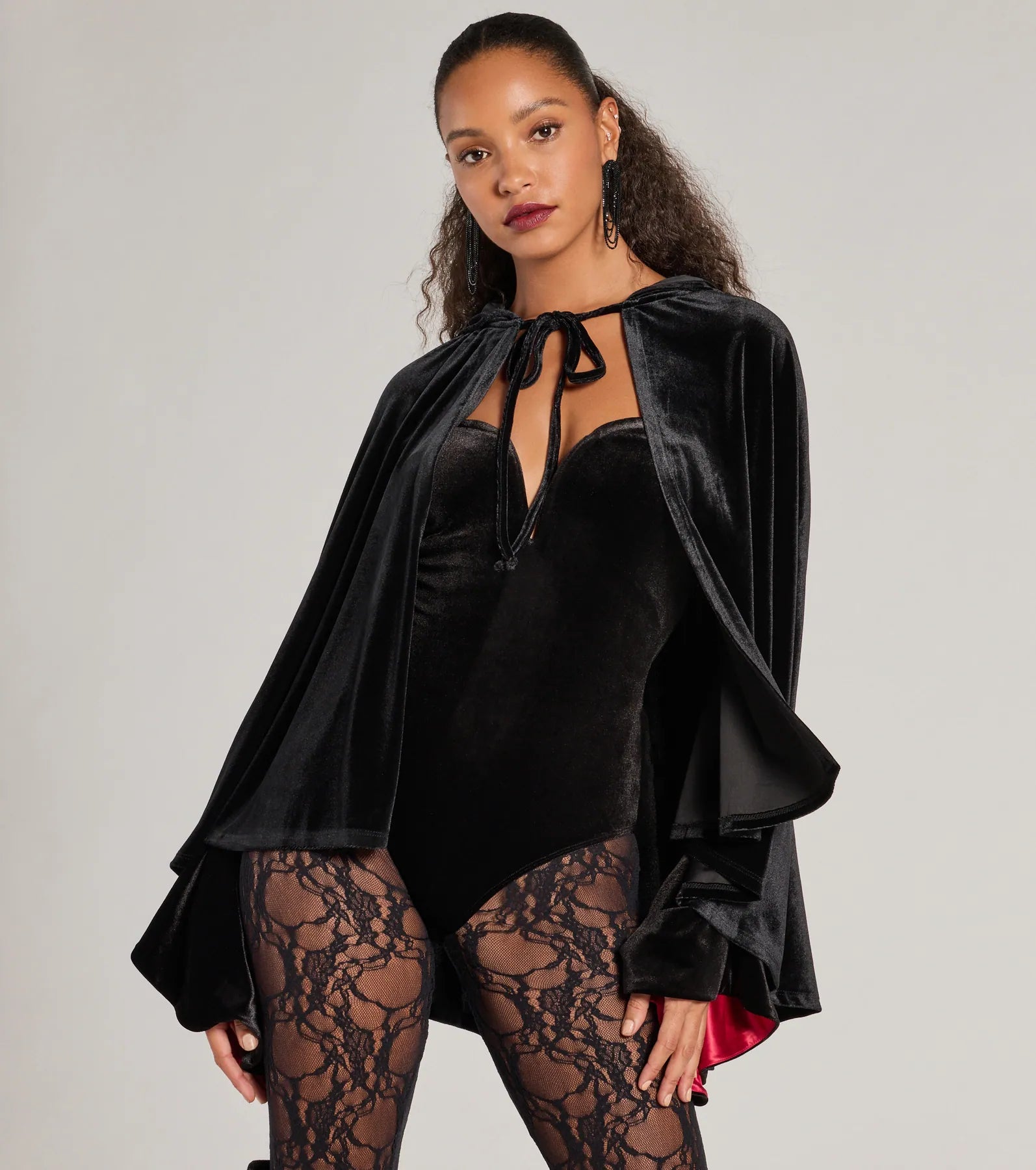 Create a spooky and sultry Halloween costume with this velvet cape! It features a hooded neckline with a tie-front closure, an open-front design, and a flowy silhouette. Complete your look with a bodysuit, sheer tights, and sleek boots!