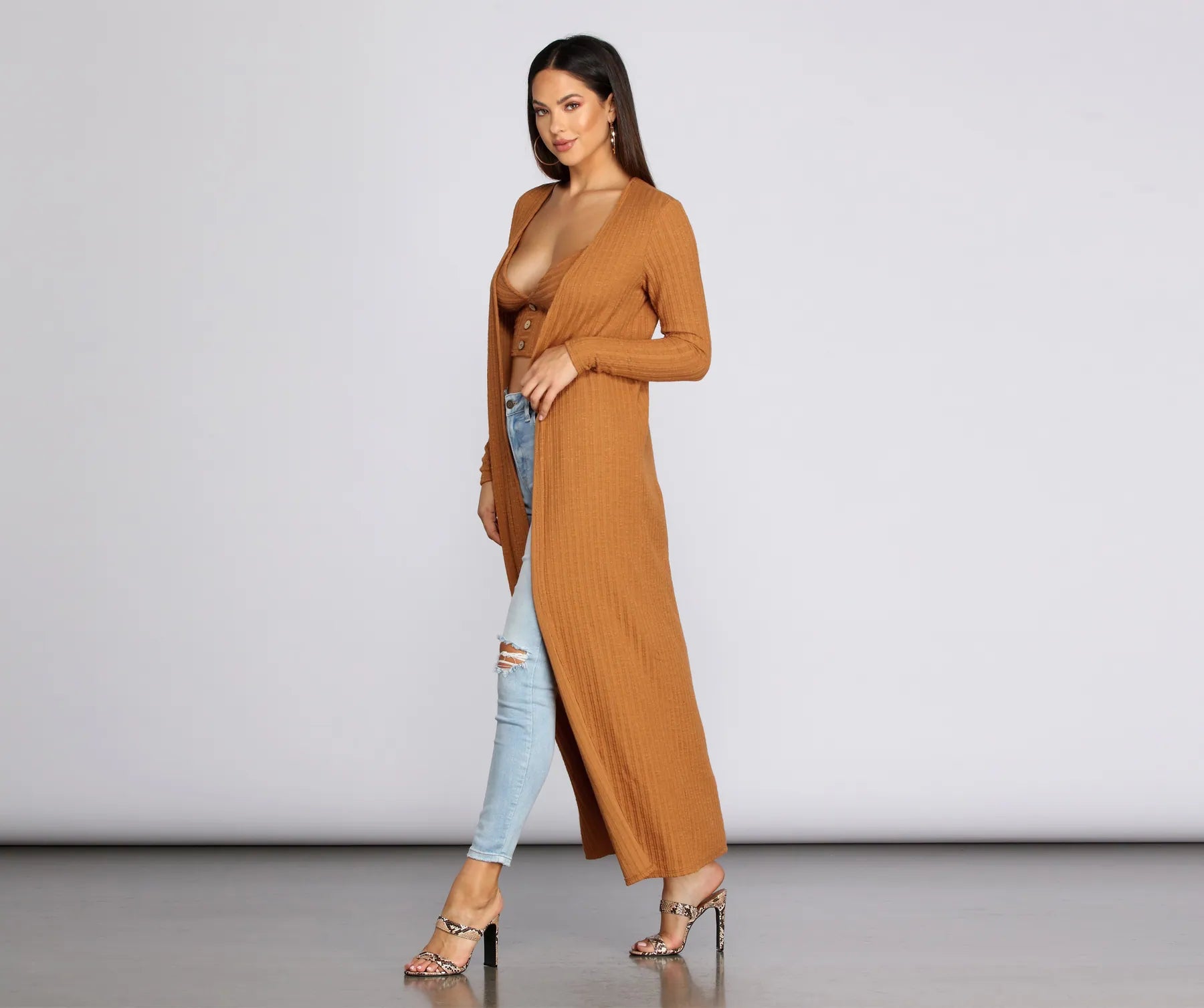 Layer up girl and flaunt your chic looks with this duster! It features a drape open front, long sleeves and a sweeping near-floor length. Duster is composed of ribbed knit fabric that offers a relaxed fit with a moderate stretch. Be sure to pick up the matching dress to complete a Fall-inspired look!