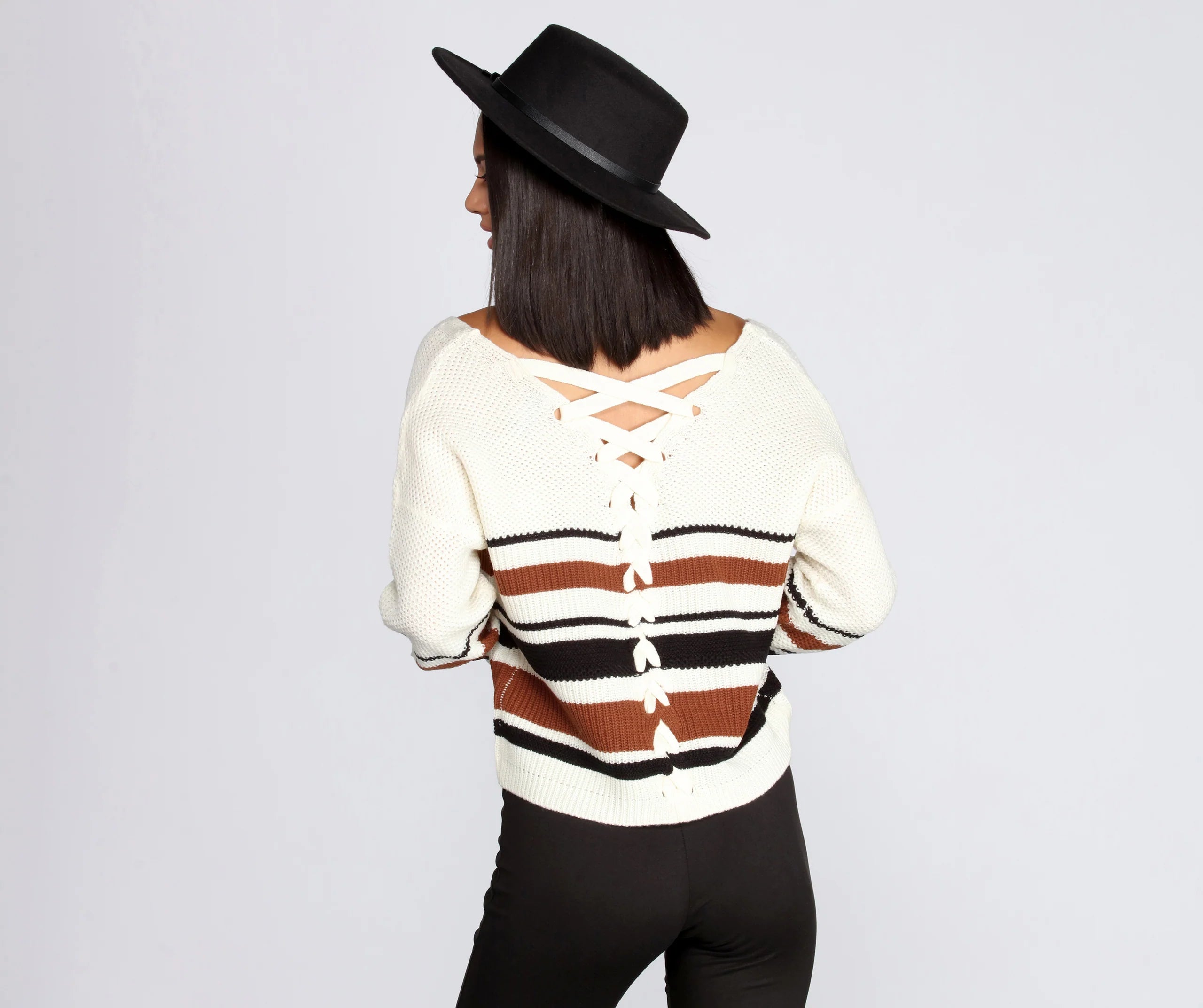 We are diving right into the fall season! This pull over sweater features a modest v neckline, long sleeves, and a lattice lace up back detail. Hem hits mid torso and pull over is composed f a knit material that shows a contrasting striped pattern. Throw on a hat and you are fall ready!
