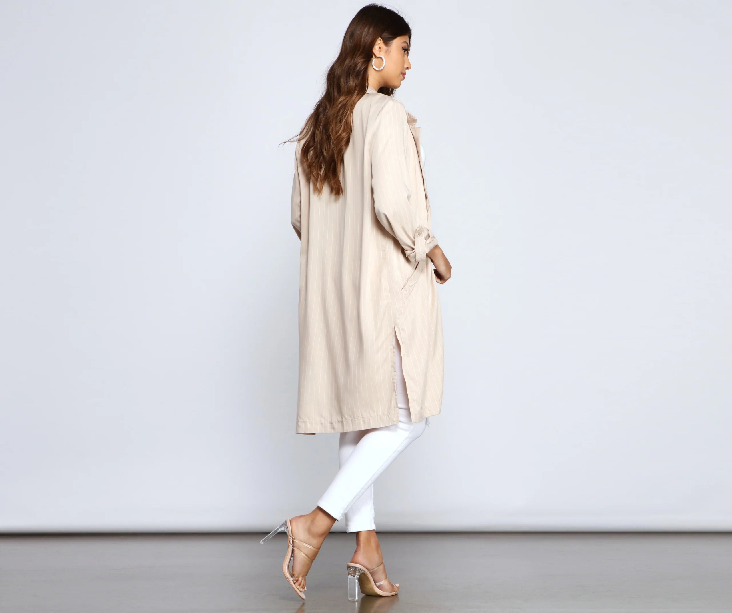 Keep it sophisticated with a long blazer to layer over your workwear outfits! The blazer features a striped pattern, a collared neckline, long roll sleeves with a single-button cuff, draped open front, hidden side pockets, and dual side slits. Complete look with a blouse and high waist pants.