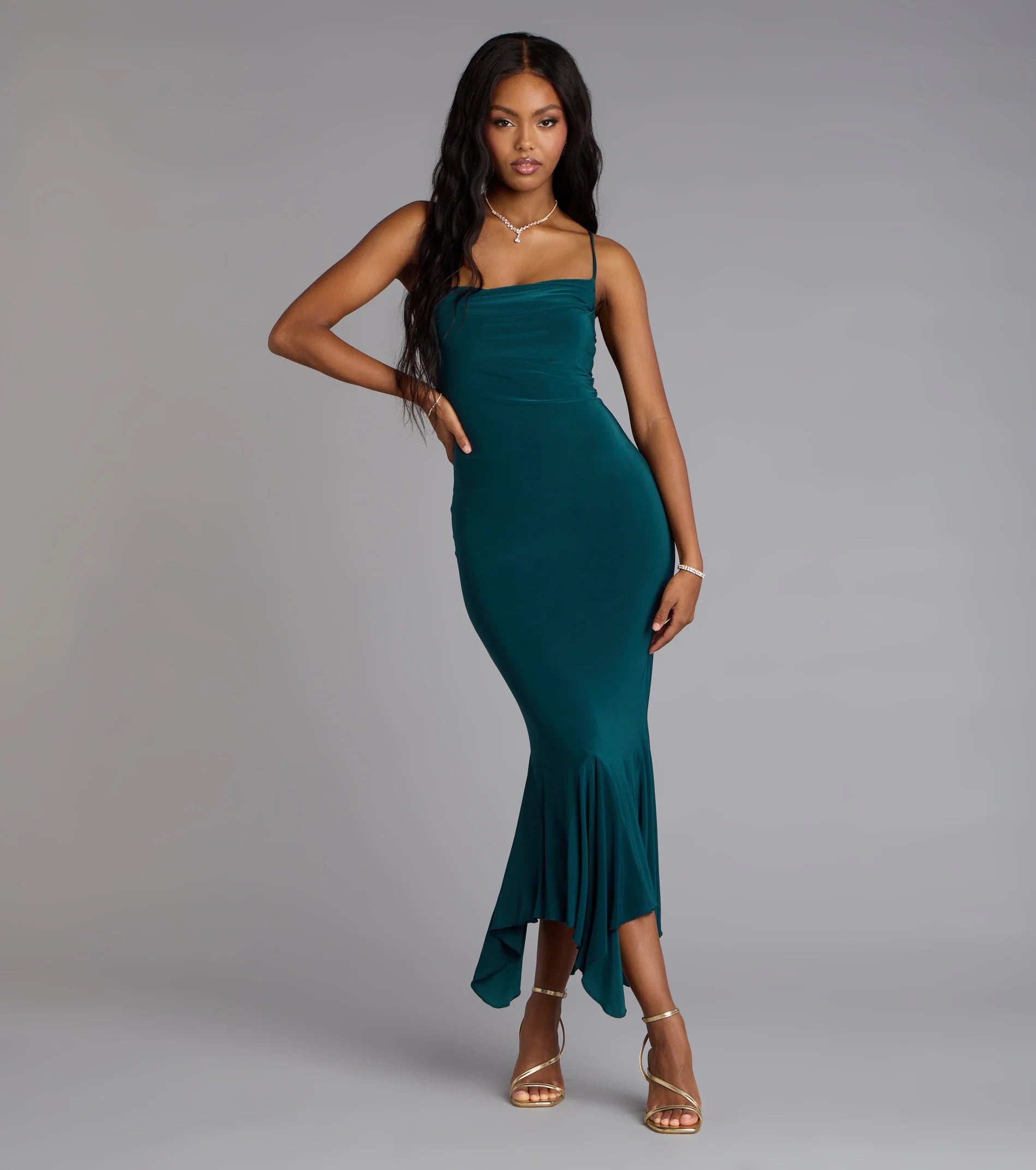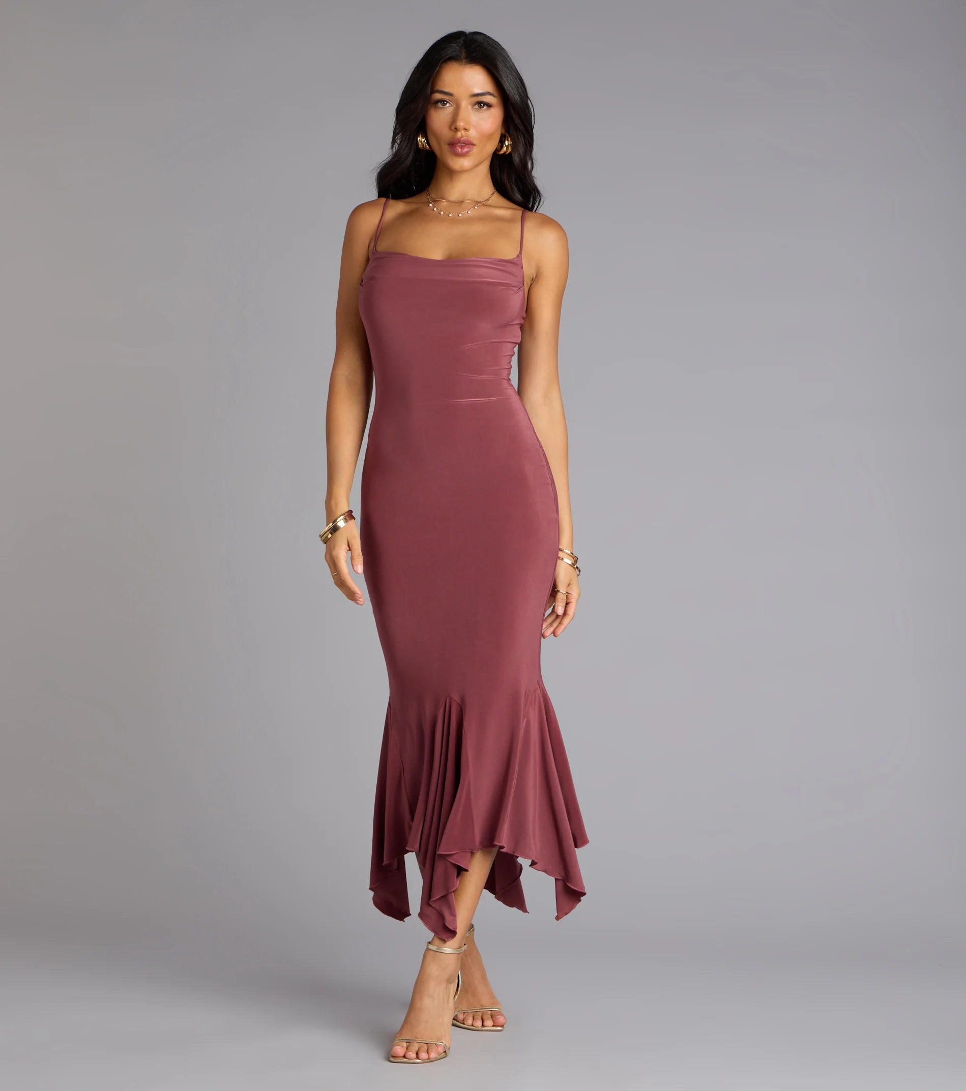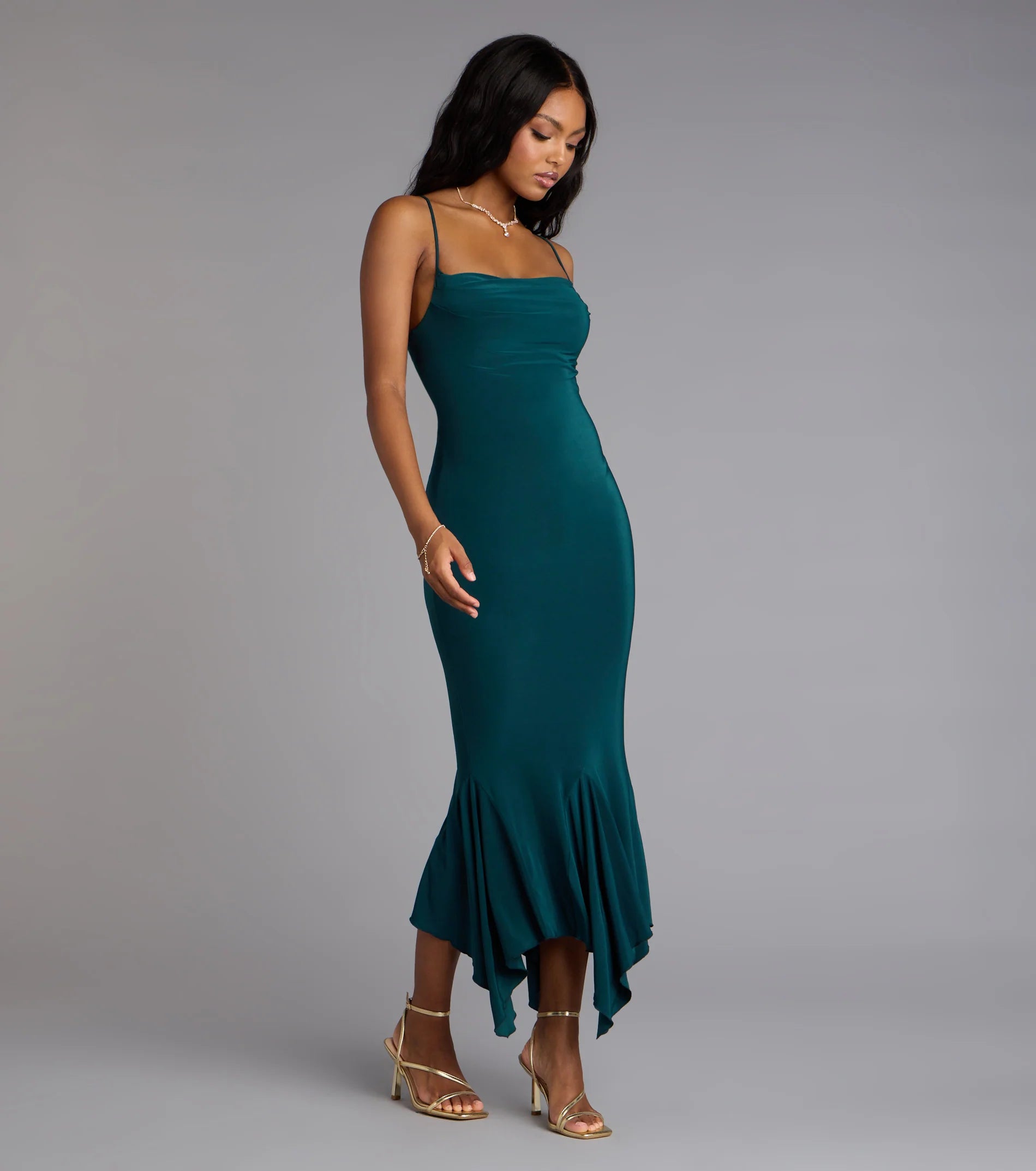 Show off a stunning silhouette in this sleek knit midi dress featuring a sleeveless square neck, ruching to flaunt your figure, and a hanky hem with a chic flared fit. Style with stilettos for cocktail hour!