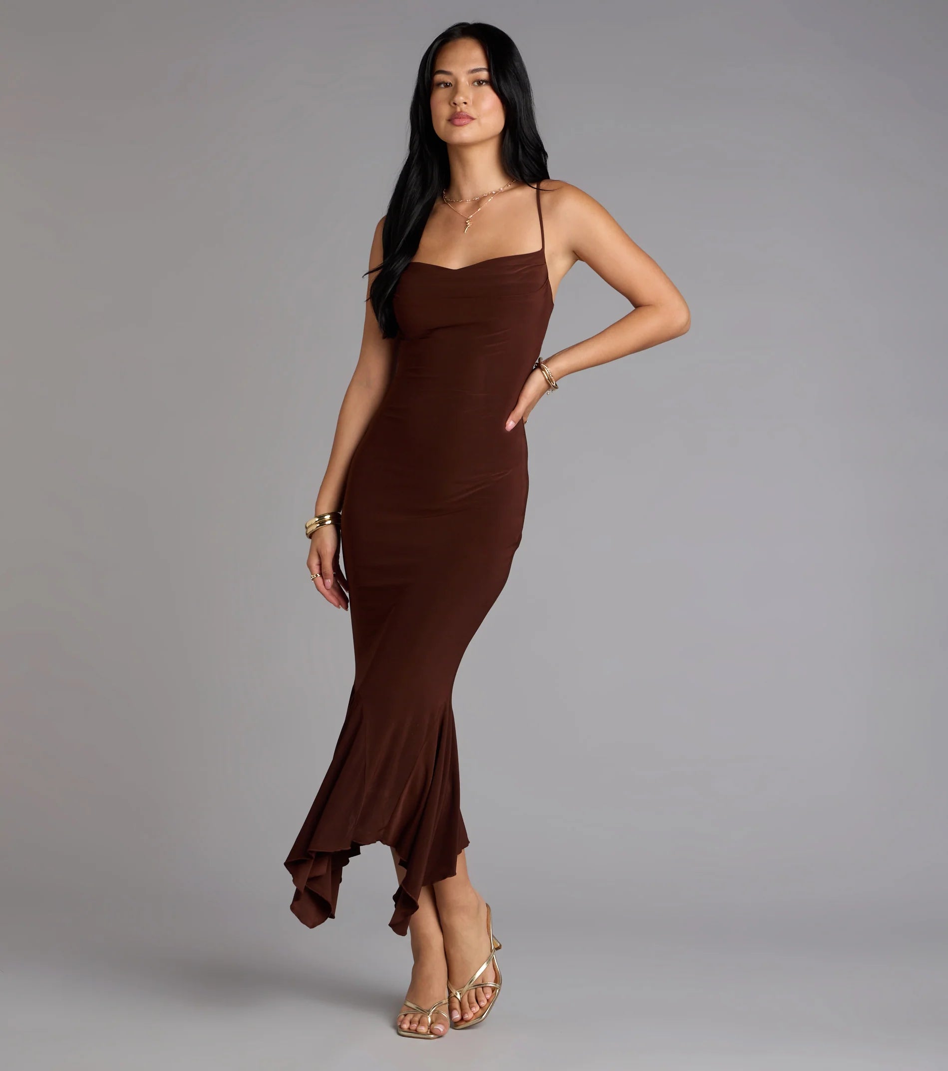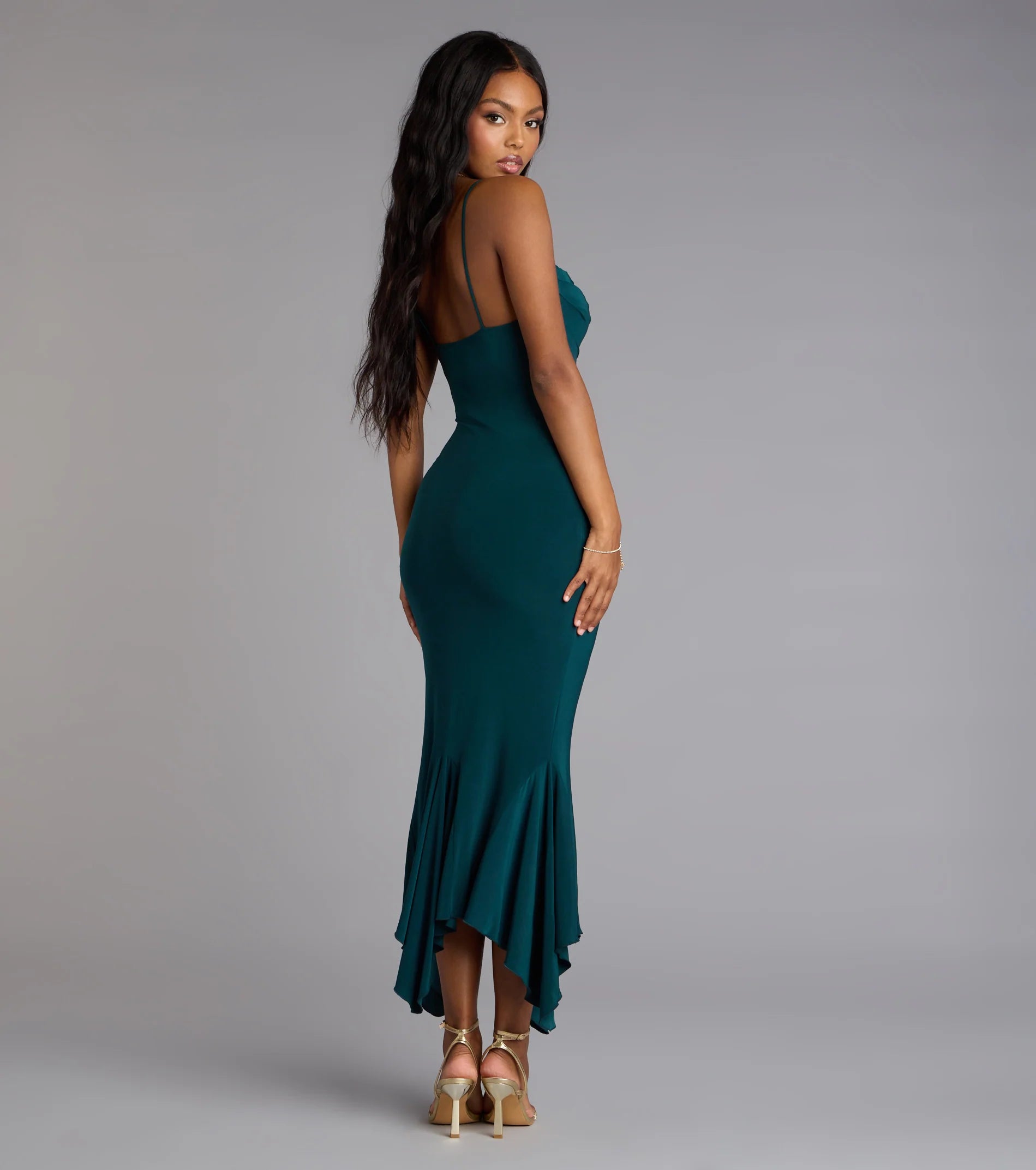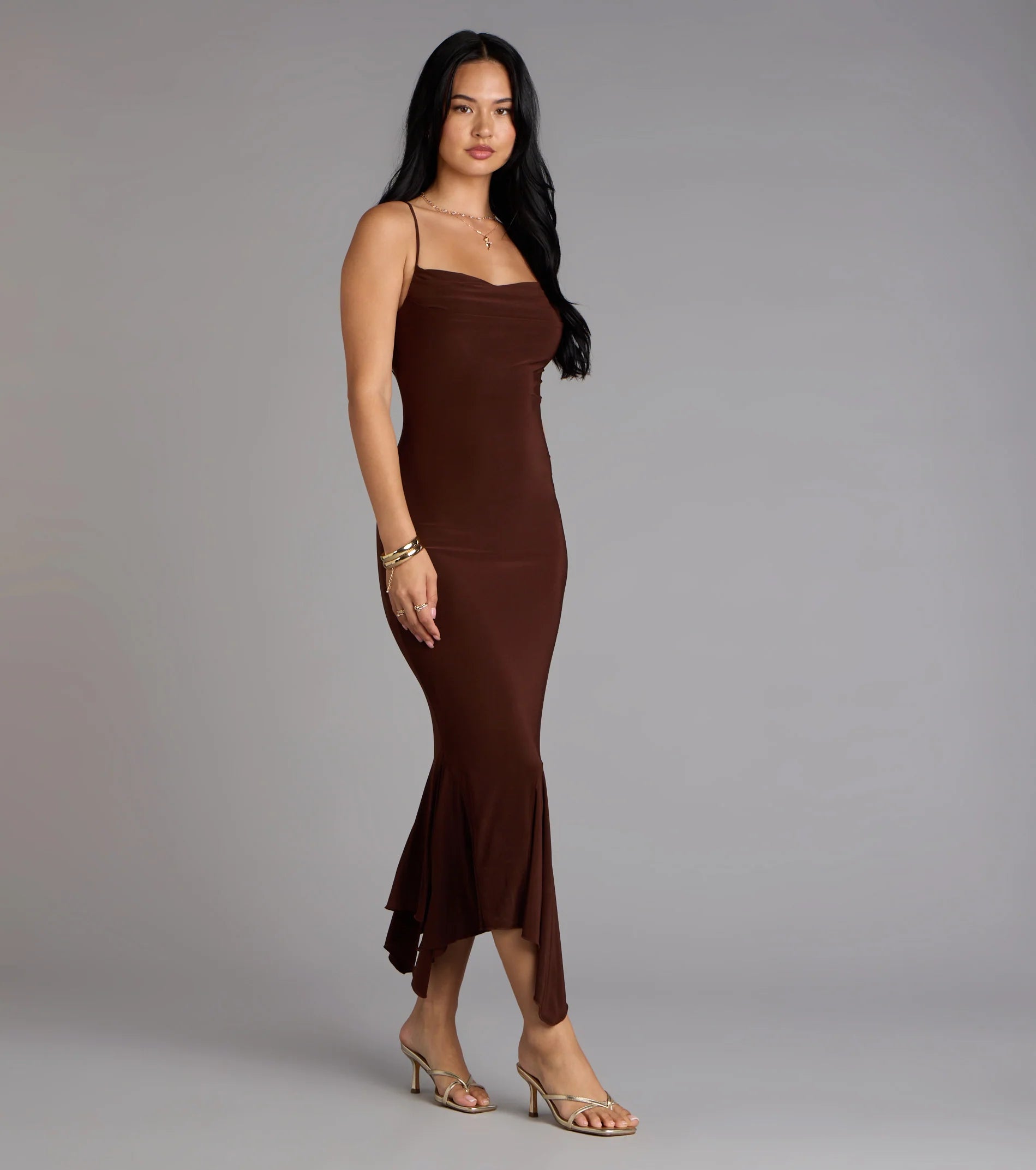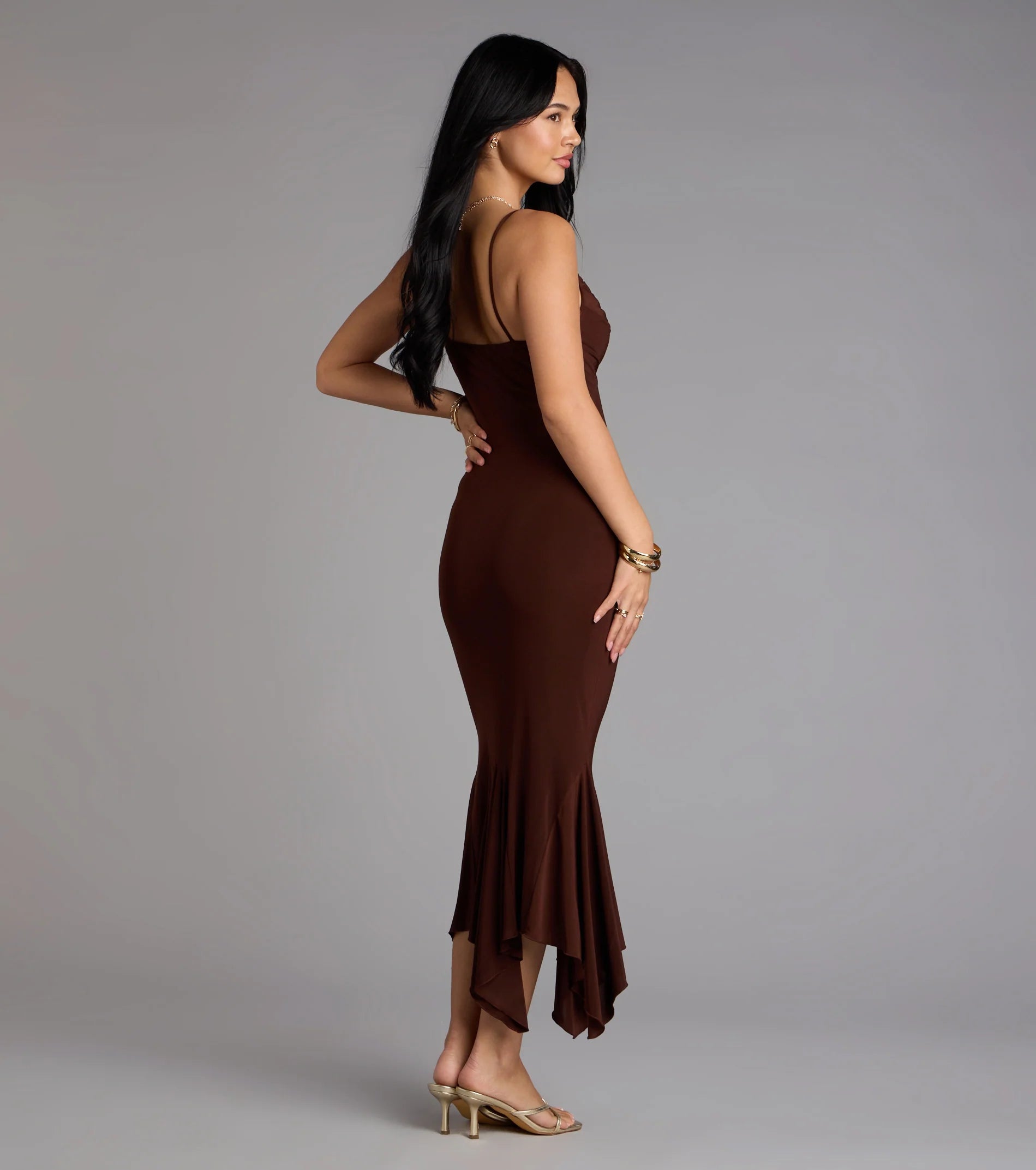 Show off a stunning silhouette in this sleek knit midi dress featuring a sleeveless square neck, ruching to flaunt your figure, and a hanky hem with a chic flared fit. Style with stilettos for cocktail hour!