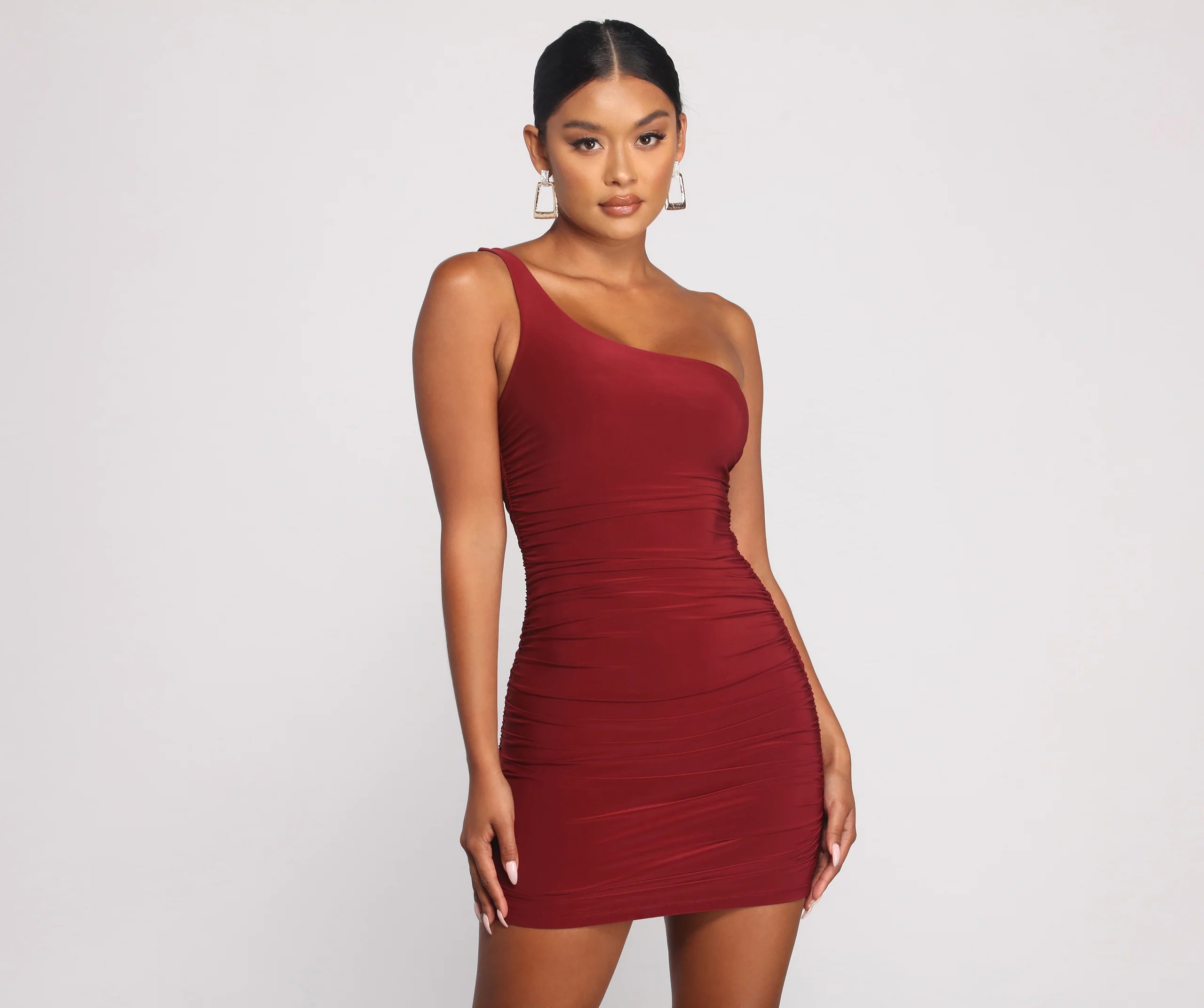 Serve stunning looks in this curve-hugging ruched mini dress! Featuring a one-shoulder neckline and sultry ruched detailing, this dress is ready for you to wear your next night out. Pair with statement earrings and heels for that chic it-girl vibe.