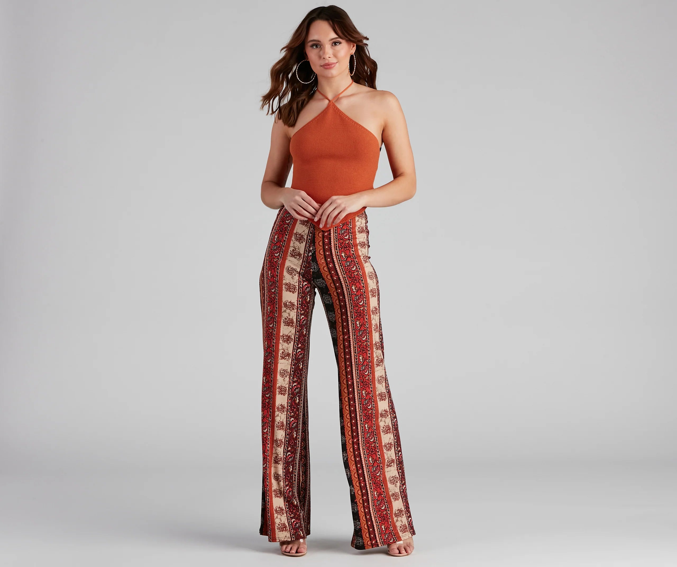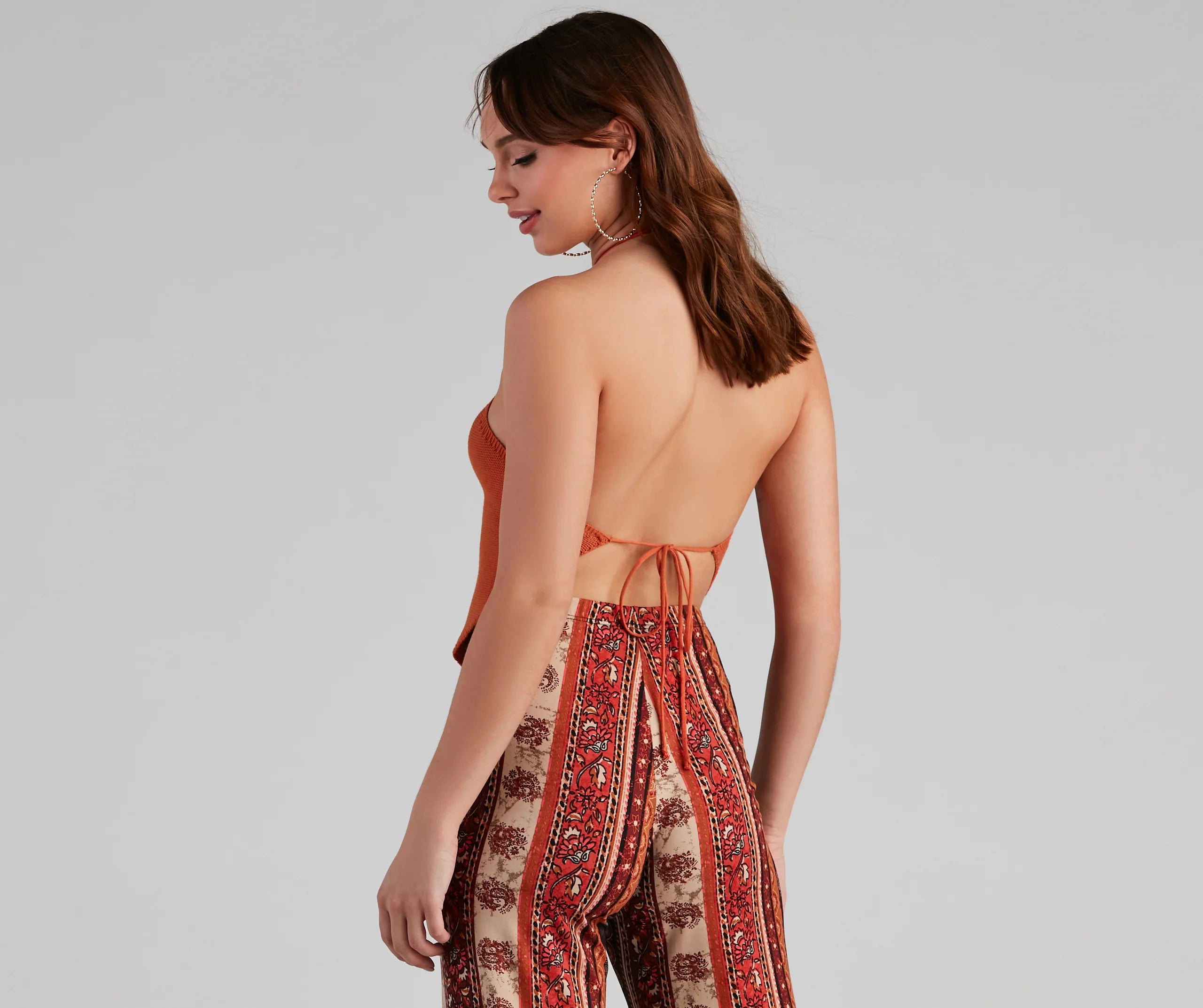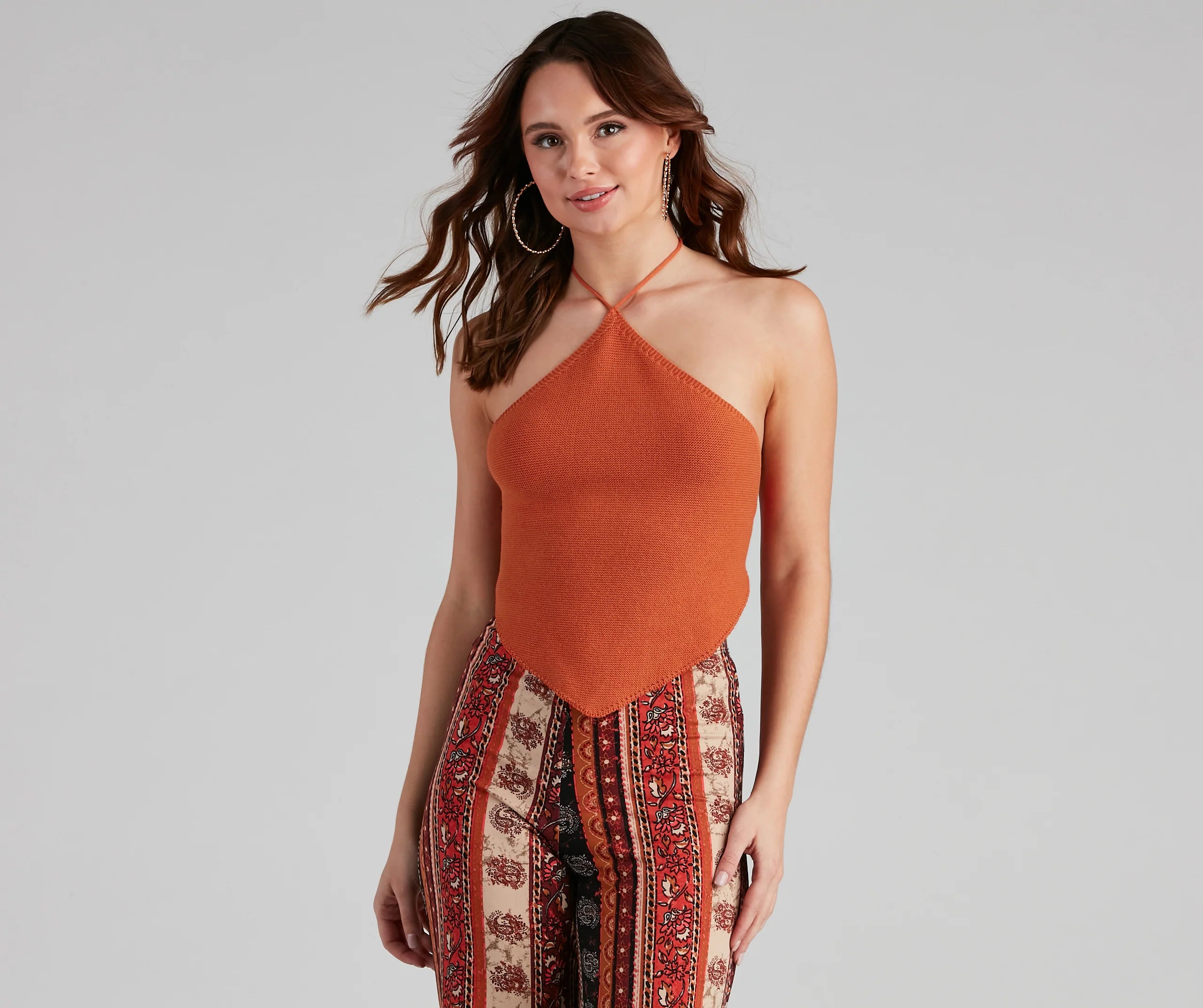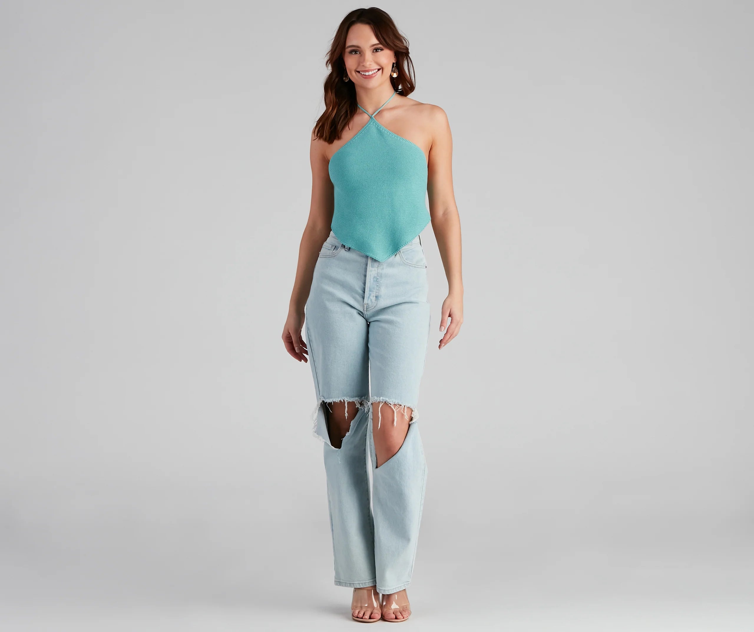 Get a summer-approved look with this trendy halter crop top. It features a handkerchief top design with a sleeveless halter neckline with tie-back straps, a completely open back with lower tie-back straps, and a cropped fit with an angled hem. Style this top with distressed denim or cute flare pants.