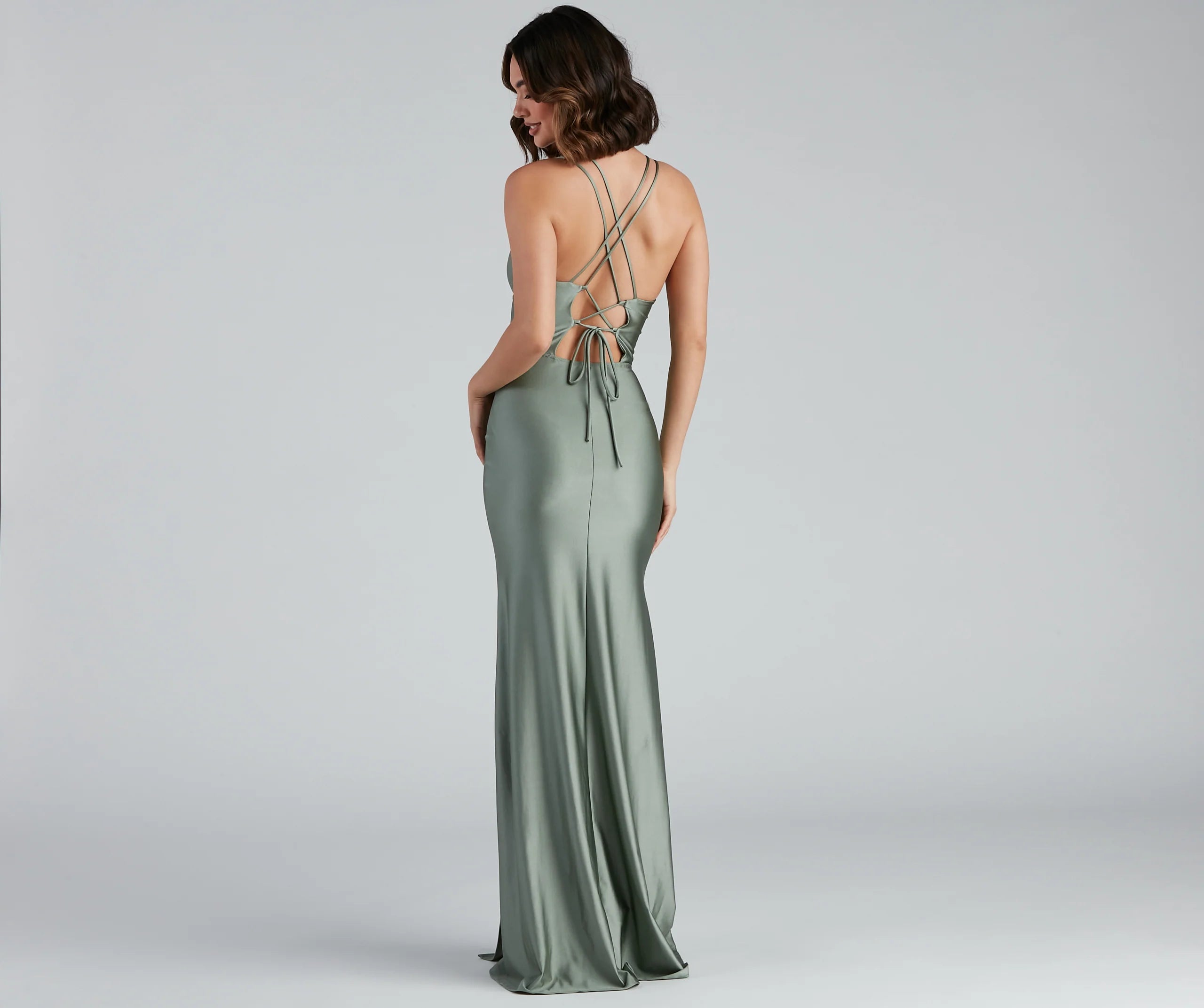 Lace-up in the Summer formal mermaid dress that will bring the elegance to your evening! Summer features a sleeveless V-neckline, a double row of spaghetti straps that lead to a bold lace-up back for a customized fit, and a floor-length, fitted mermaid silhouette accented with a high side slit to show some leg. The dress is composed of a satin knit fabric that offers a form-hugging fit. Complete the look with rhinestone heels and a clutch.