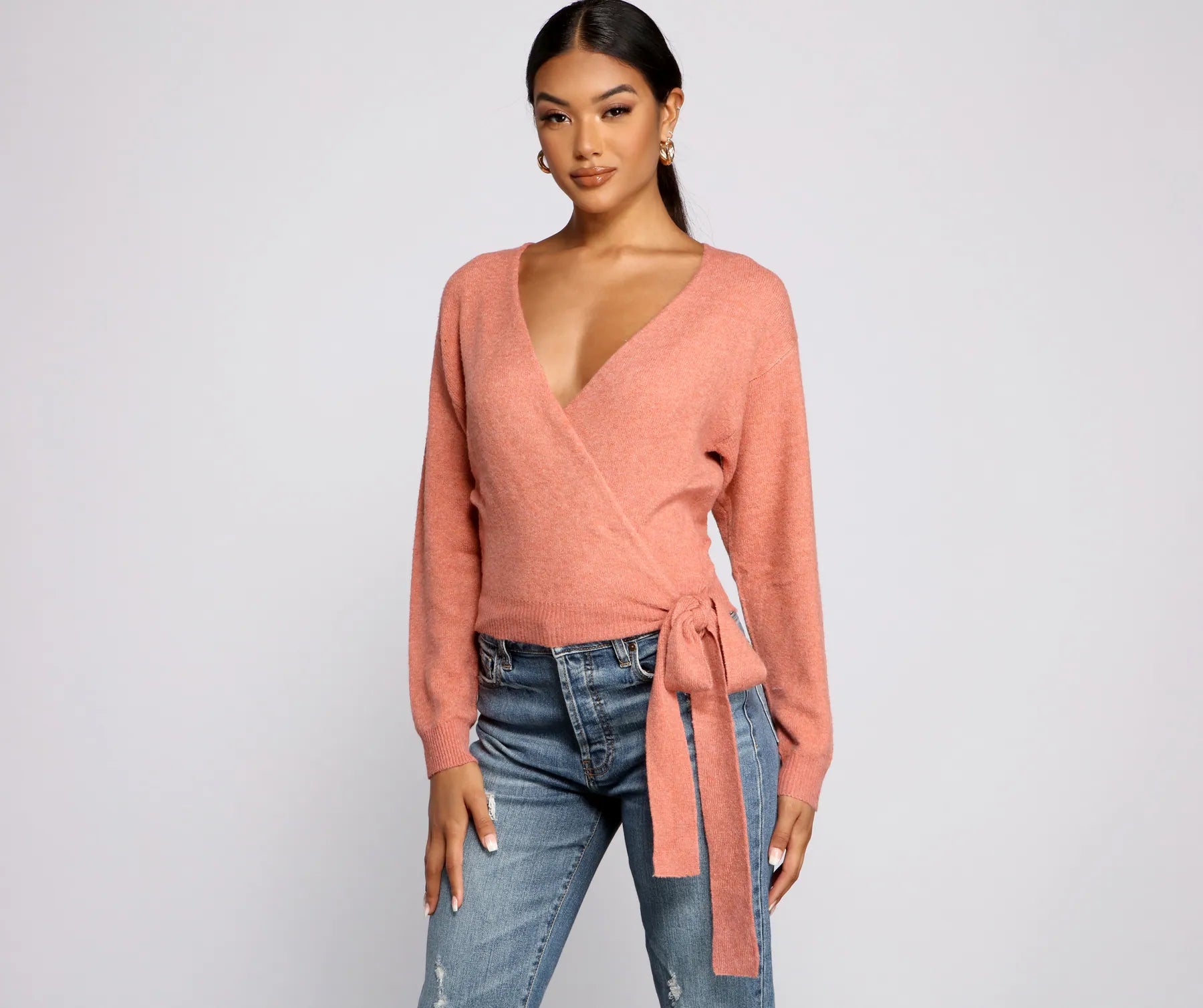 Show off your sweet side in a sweater that is oh so adorable! The sweater features a surplice neckline, long sleeves, and a chic tie waist belt. Complete look with a pair of high waist jeans and ankle booties.