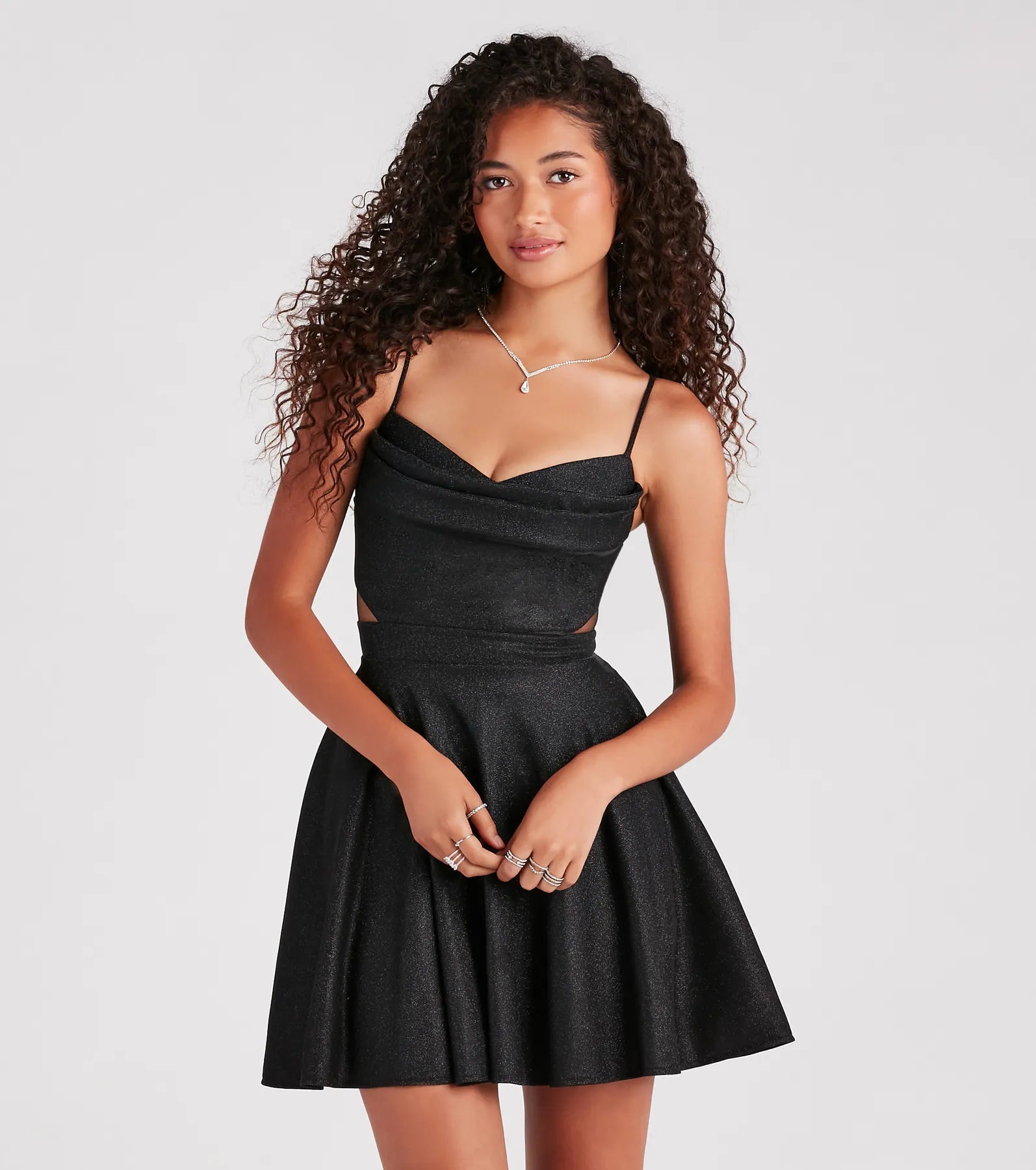 Give off a stunning shine that will capture total glam vibes at HOCO with the Taya woven glitter formal skater dress! She features a sleeveless cowl neckline, a built-in padded bust that eliminates the need for a bra, and adjustable spaghetti straps for a customized fit. The sheer mesh waist inserts at each side show off a hint of skin leading to high waist seams, a short skater skirt with hidden side pockets, and a flirty fit and flare silhouette. The woven glitter fabric includes a full-length lining. Complete your look with rhinestone fringe earrings and metallic platform heels!
