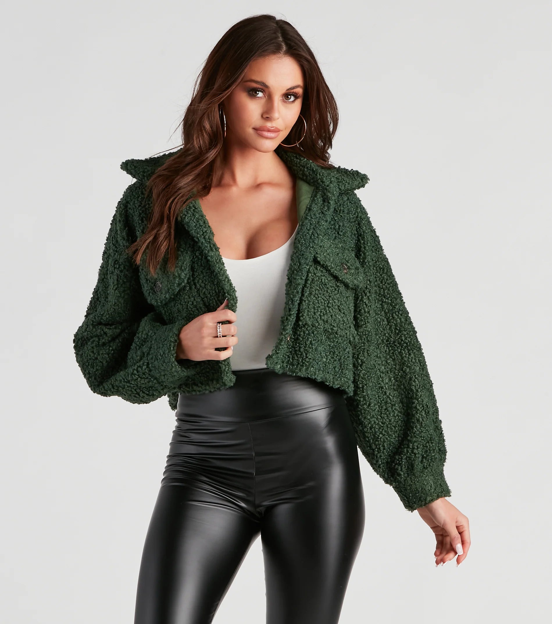 The look and feel of your favorite teddy in the comfort of this faux sherpa crop jacket! Stay cozy and cute this season in this jacket featuring drop shoulder long sleeves with buttoned cuffs, a collar neckline, front button-down closures, and flap pockets. Complete the look in trendy lug boots.