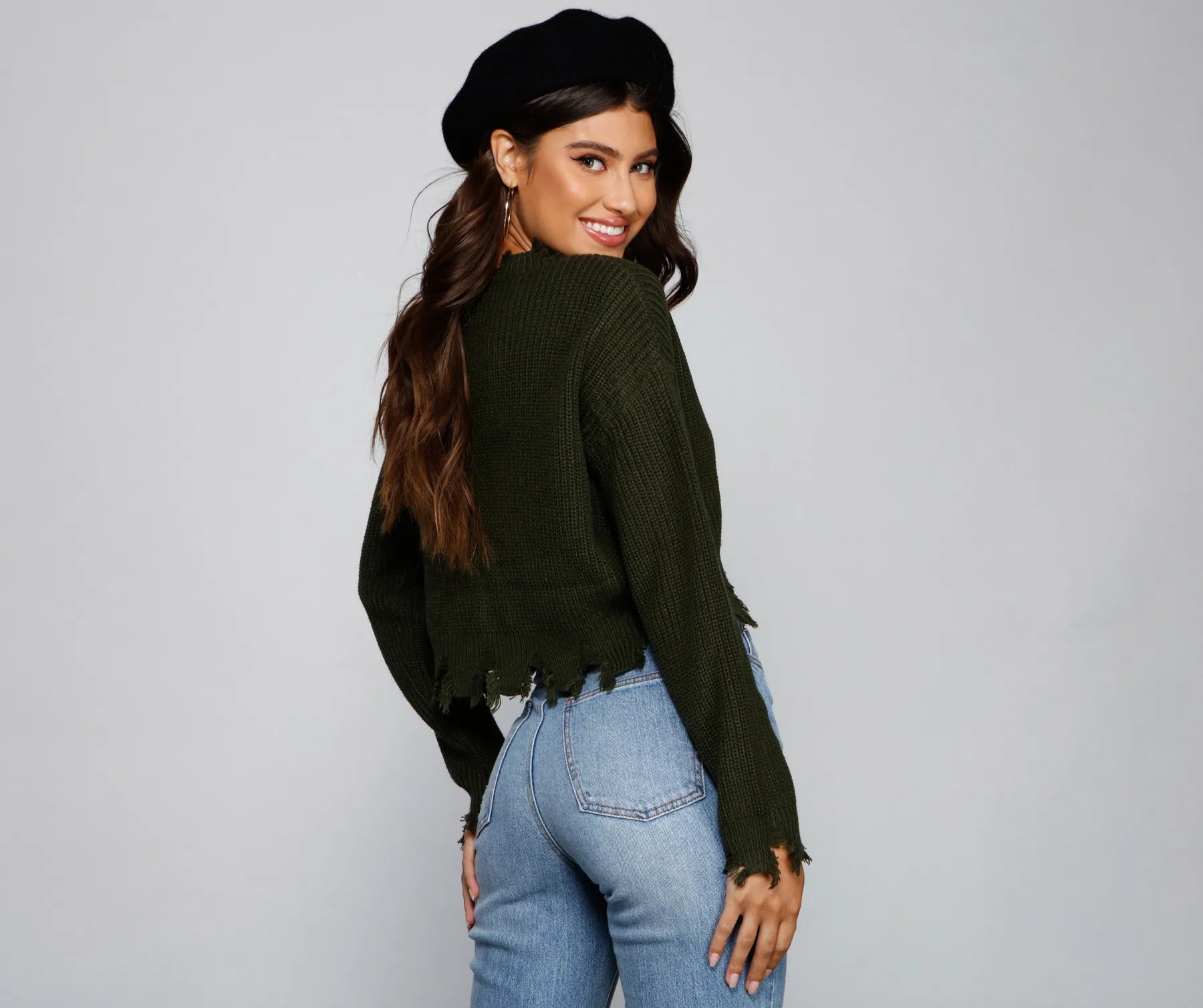 Rock it out in a casual sweater to warm up those chilly days! The sweater features a crew neckline with a raw edge hem, long sleeves, and a cropped hem with a raw edge. The sweater is composed of a knit fabric that offers a relaxed fit with a moderate stretch. Complete look with high waist jeans.