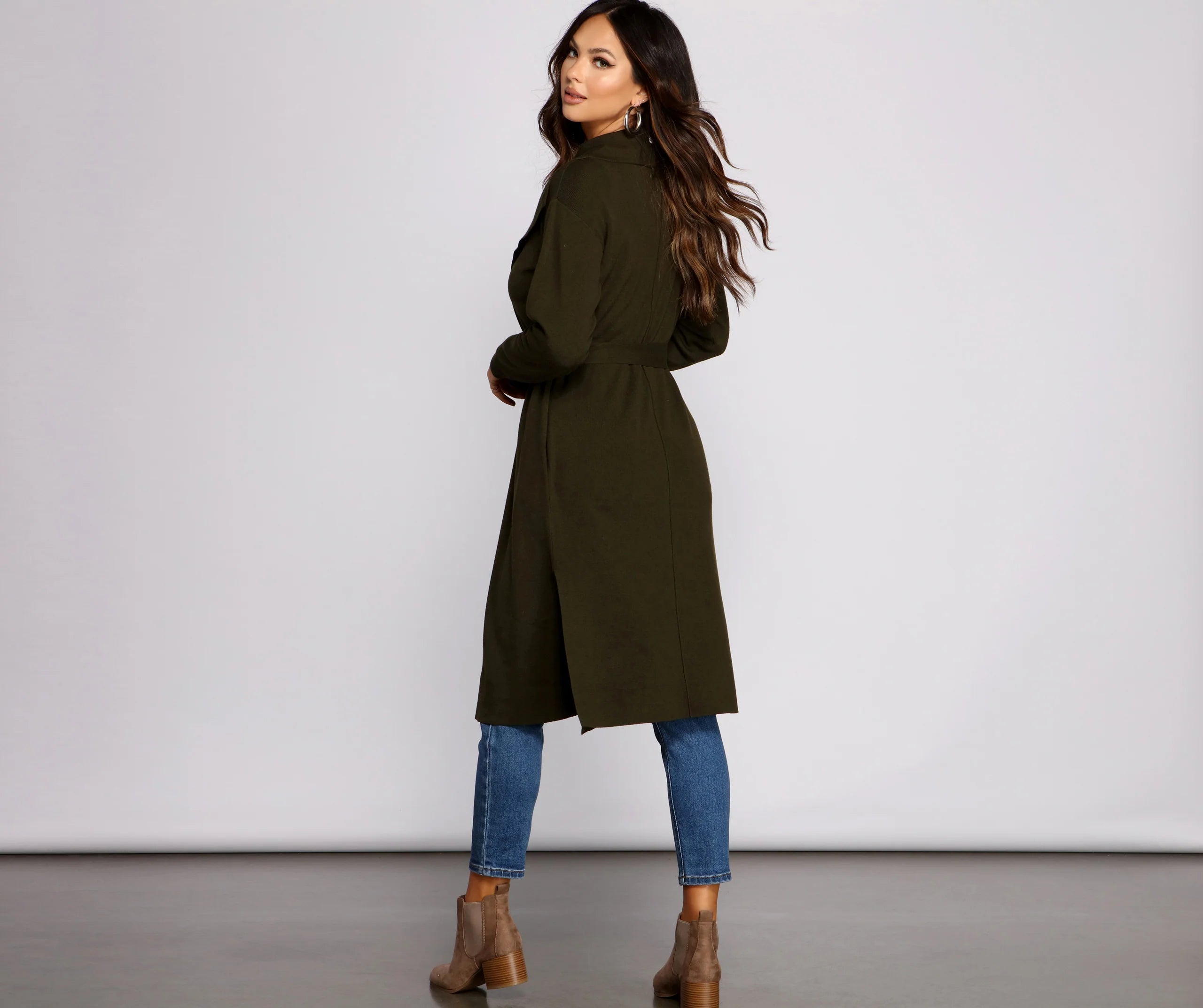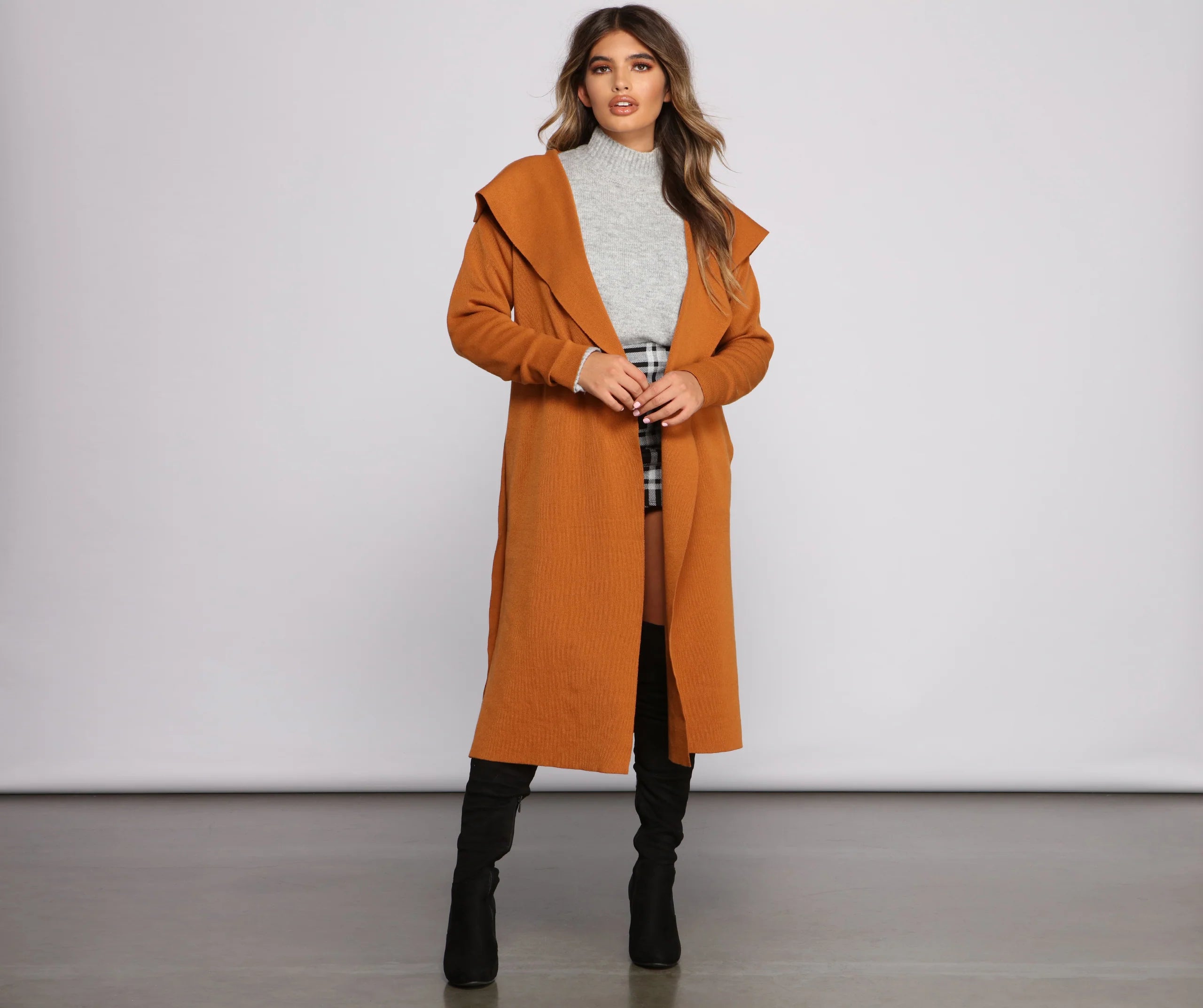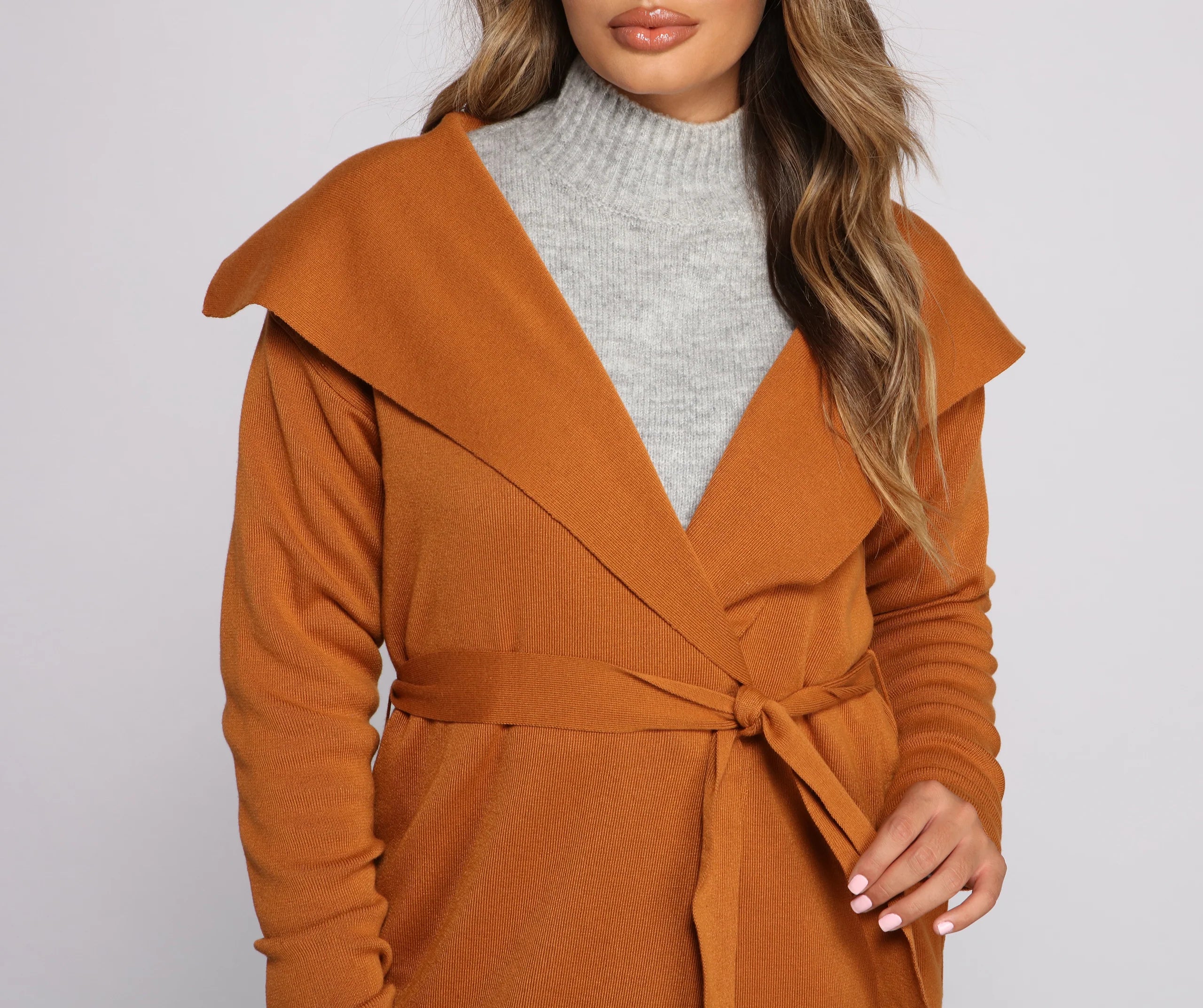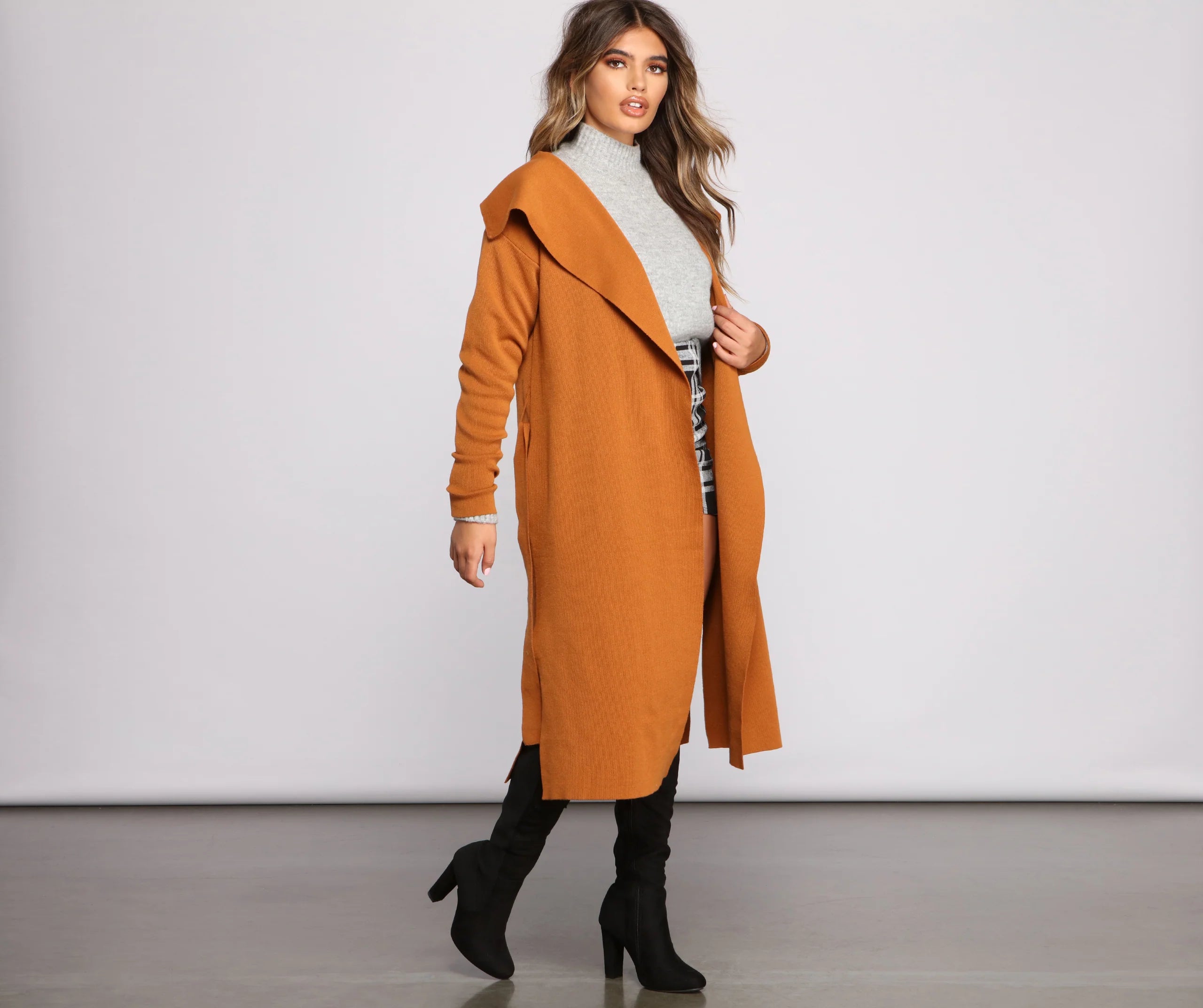 Tie your look all together with this adorable long line cardigan! It features a lapel collar, a long line design with side slits, side pockets, and a tie front belt to cinch your waist. Layer this cardigan over a simple cropped tee and high waist denim for a chic fall time look.