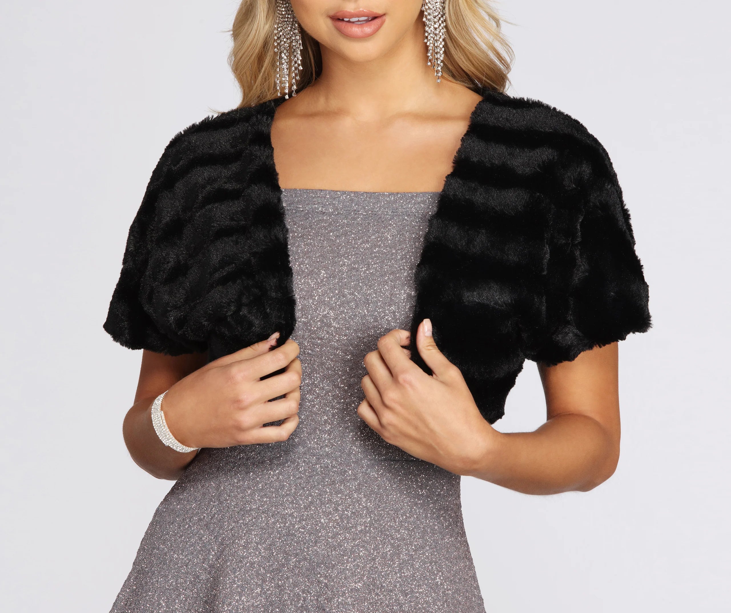 Bring the elegance to your evening looks with a chic cover up! It features an open front, short sleeves and an all over faux fur fabric. Cover up also features a smooth knit lining.