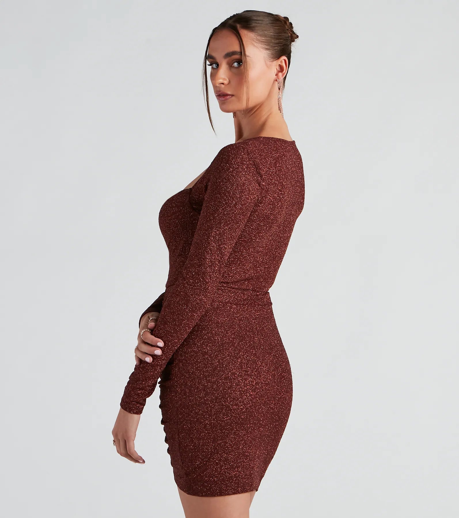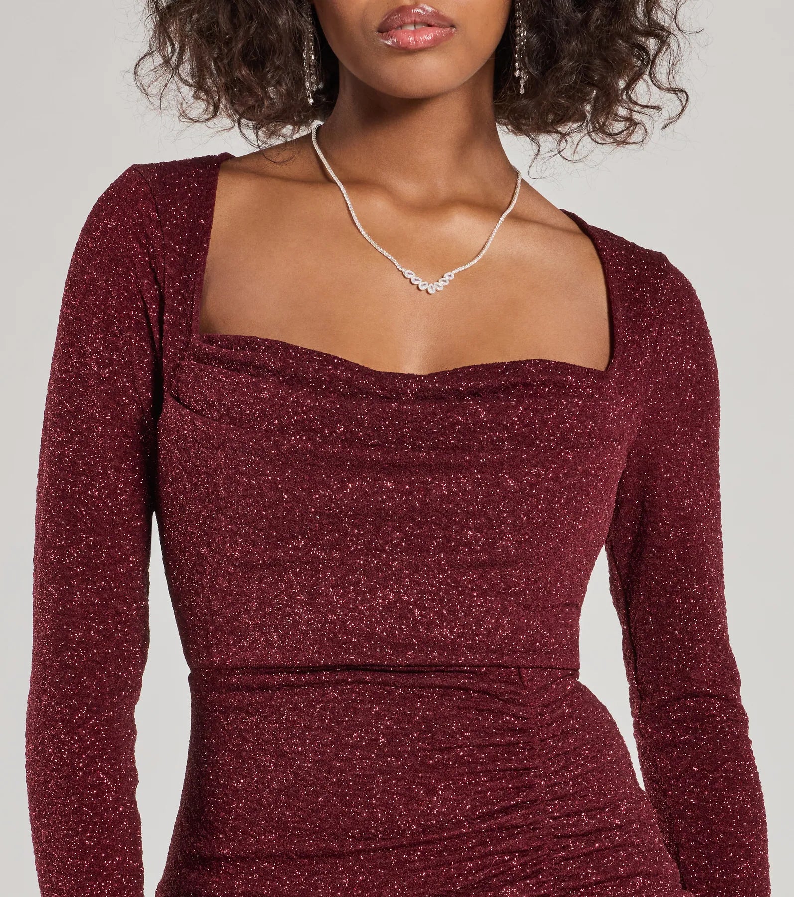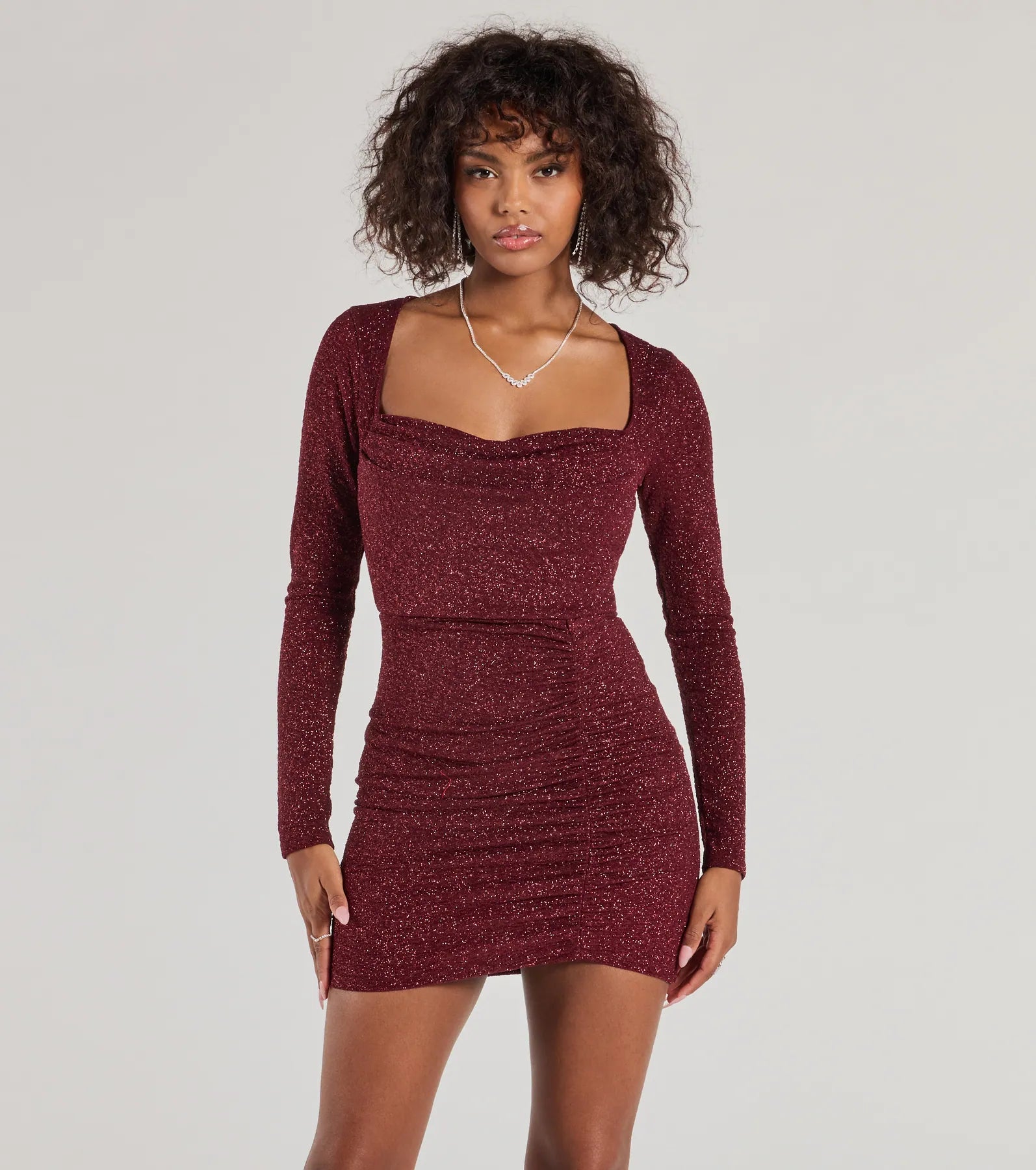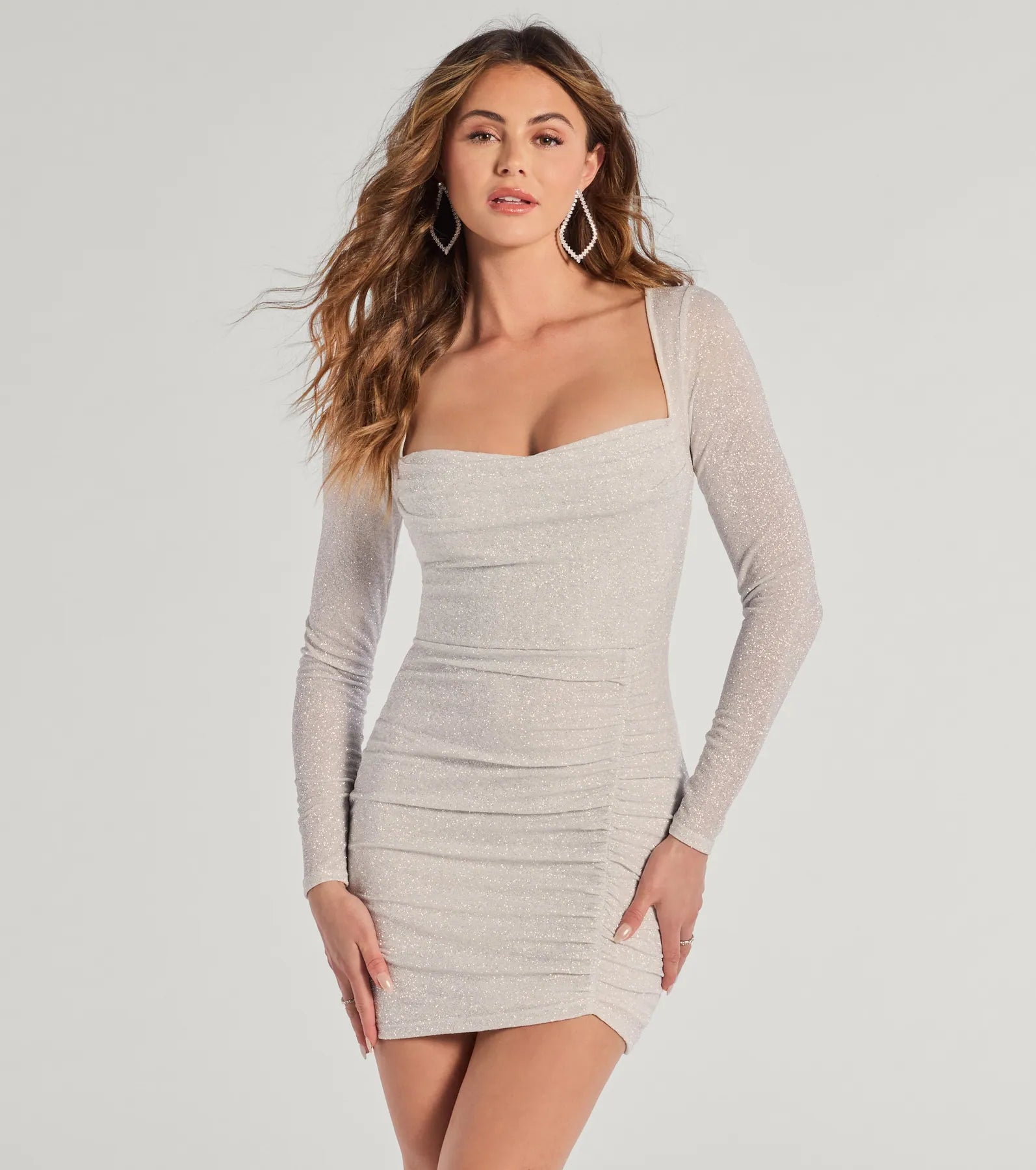 Glistening glitter makes its mark on the picture-perfect Toni mini dress for your next formal dance! She features long sleeves, a cowl neckline, a high-waist seam, and a front ruched seam along her bodycon silhouette. The formal dress is composed of a glitter-knit lined fabric with plenty of stretch. Complete your dressy look in statement earrings.