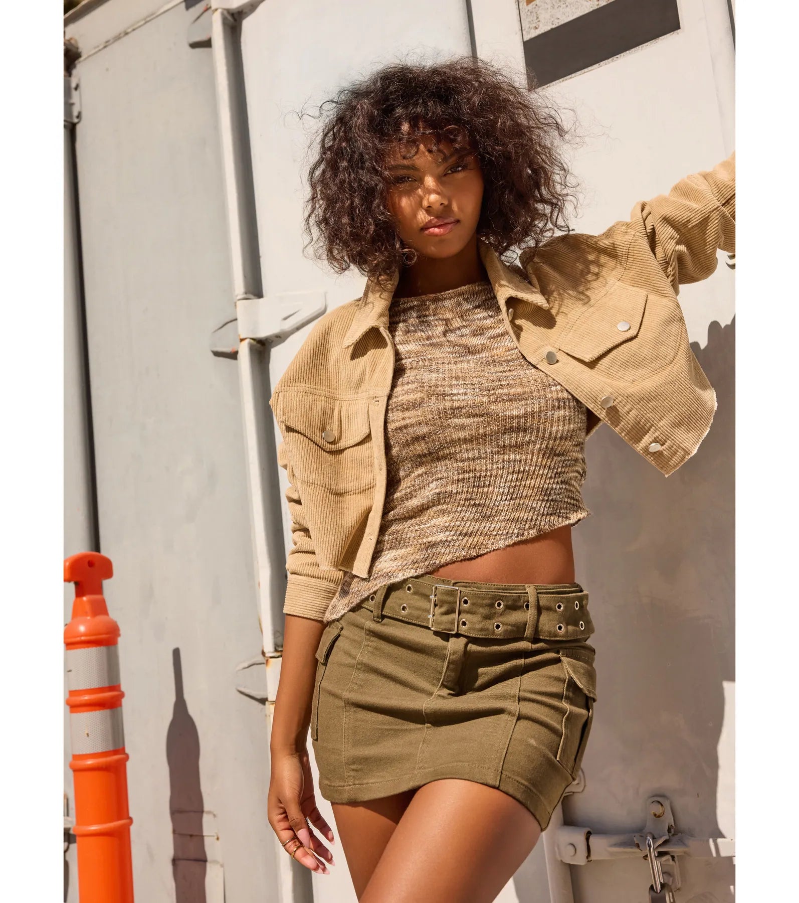 Make a trendy impression in this mixed knit top showcasing trendy long bell sleeves and an asymmetrical crop hem. Pair with jeans.