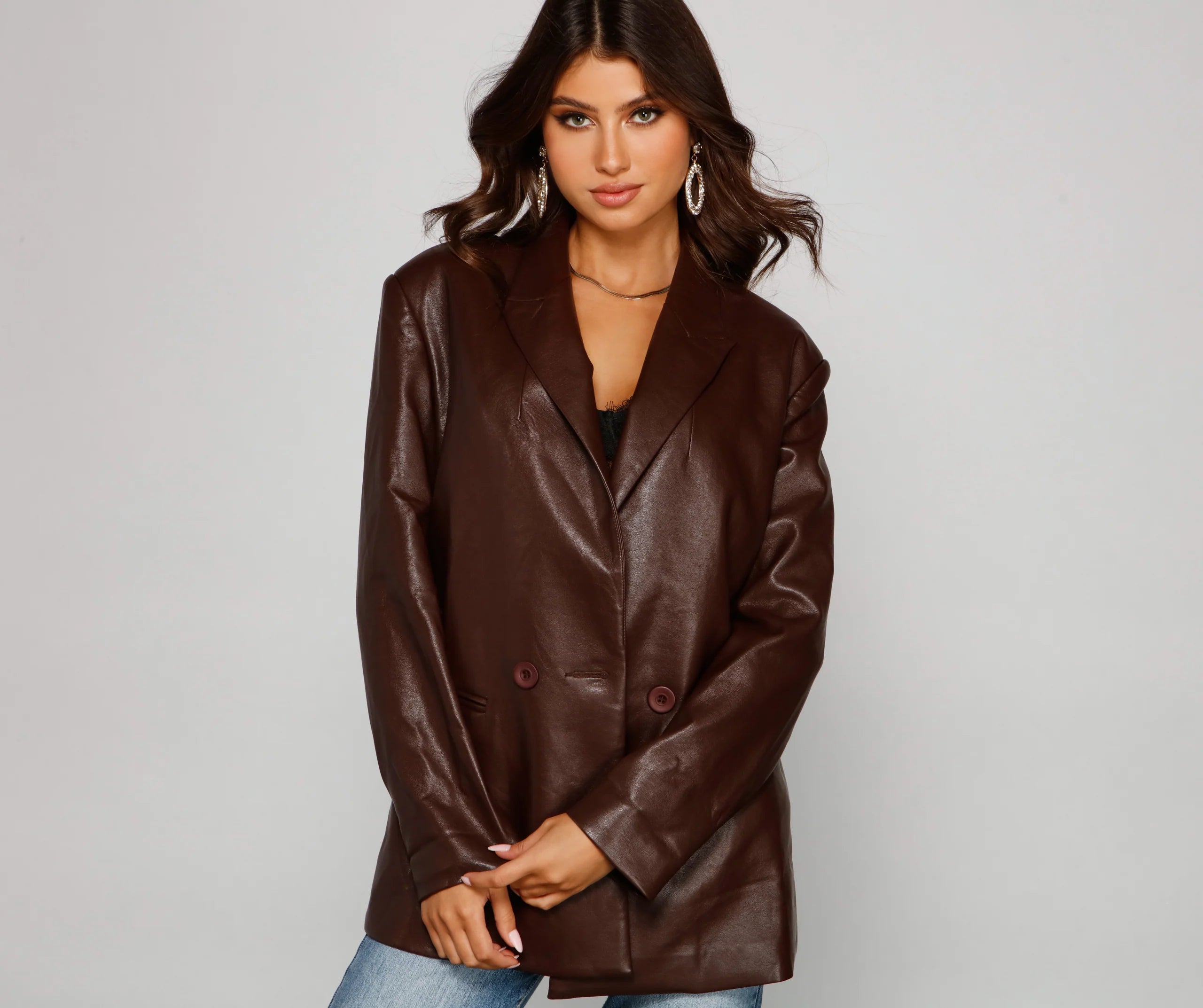 Keep it trendy with a blazer that layers on the style! This blazer features a collared neckline with lapel accents, a double-breasted button design, lightly padded shoulders, long sleeves, faux front pockets, and a long hem. The blazer is composed of a lined faux leather fabric that offers a relaxed fit with minimal stretch. Complete the look with a corset top and boyfriend jeans for weekly happy hour!