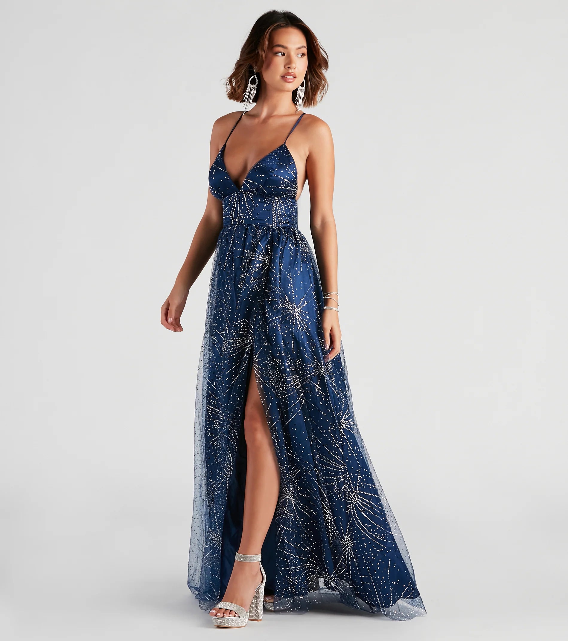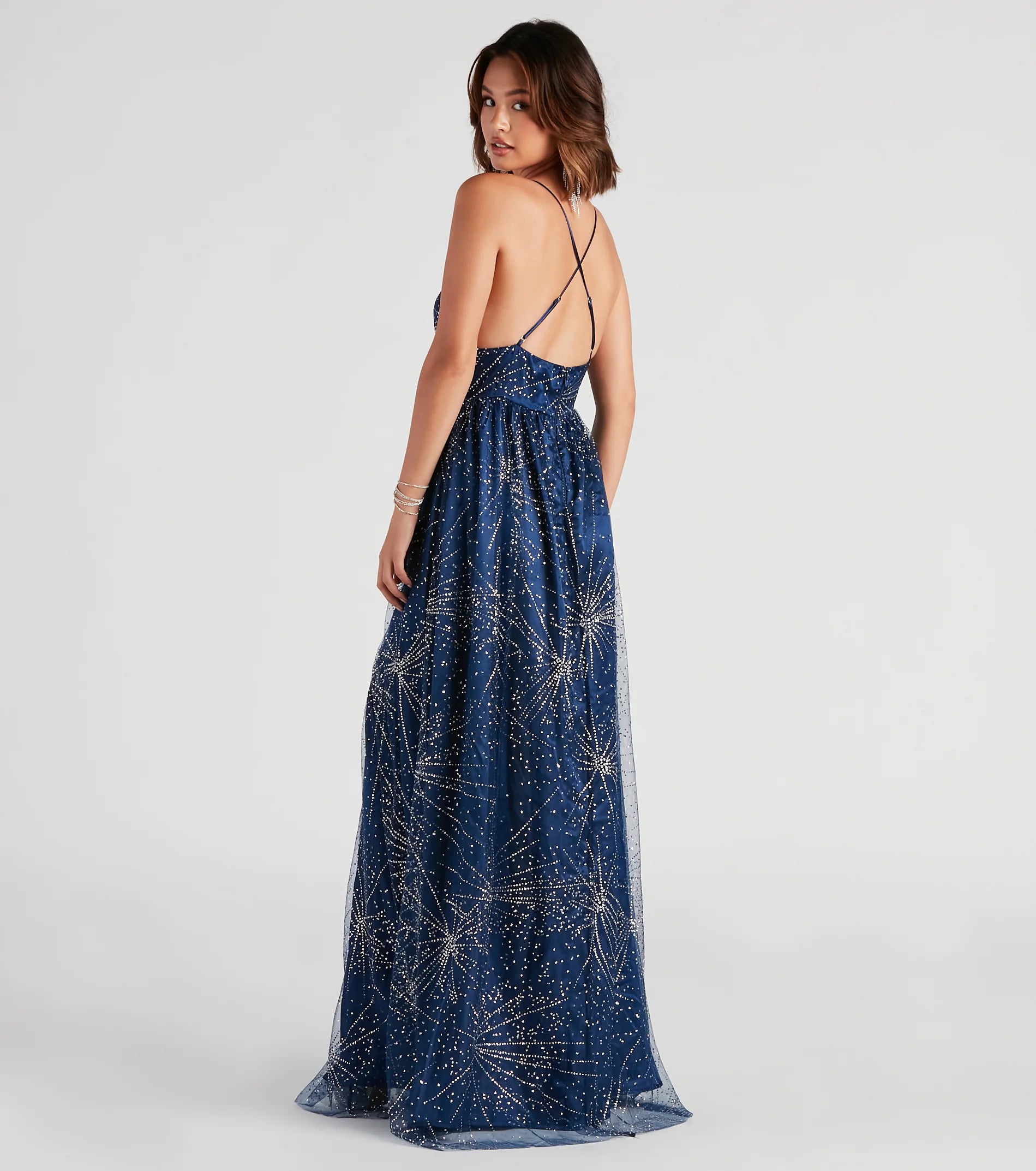 Serve pure radiance in the Tricia formal dress to make a striking entrance at balls, school dances, and galas! She features a sleeveless, plunging V-neckline with adjustable spaghetti straps that cross along her sexy open back. Her empire waistband leads to the A-line, floor-length hem designed with a skin-flaunting high slit. The formal dress is composed of a star glitter pattern on tulle fabric with satin lining and no stretch. Complete your elegant look in fringe earrings and heels.