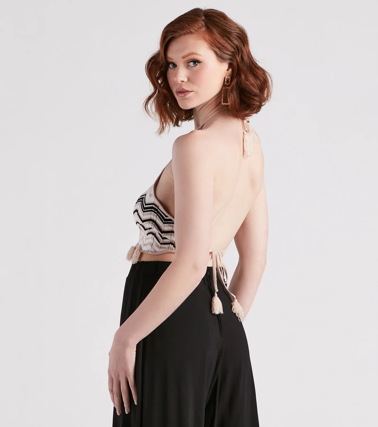 Let the sun kiss your shoulders in this sweater knit top for festivals, concerts, or any weekend plans! It features a sleeveless halter neckline with a tassel tie-neck closure, a fitted crop hem with tassel trim, and a sultry open-back with a tassel tie-back closure. The top is designed with a multi-colored chevron knit fabric with minimal stretch. Complete the look in flare denim jeans.