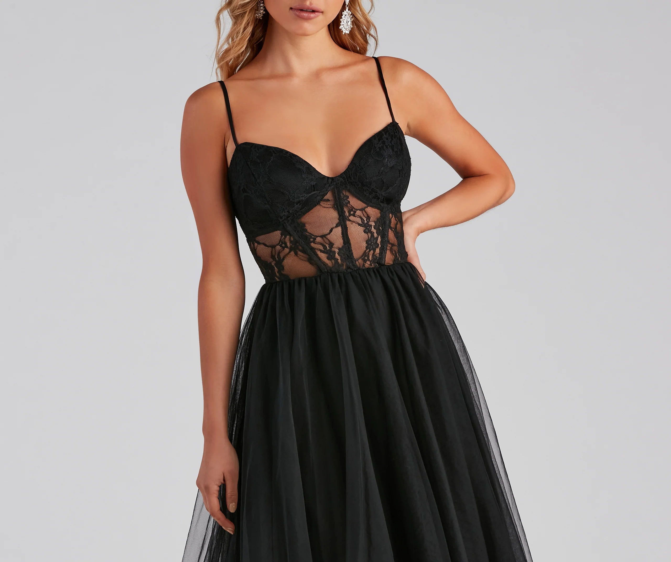 Sultry yet whimsical, the Vanae formal dress brings romantic allure in her twirl-worthy tulle skirt and lace illusion bodice! She features a classy sleeveless V-neck, adjustable spaghetti straps so you can customize the fit, and a corset-style bodice with flexible boning inserts for structure and shaping. Her flowy A-line silhouette hits mid-calf - perfect for flaunting some gorg heels.