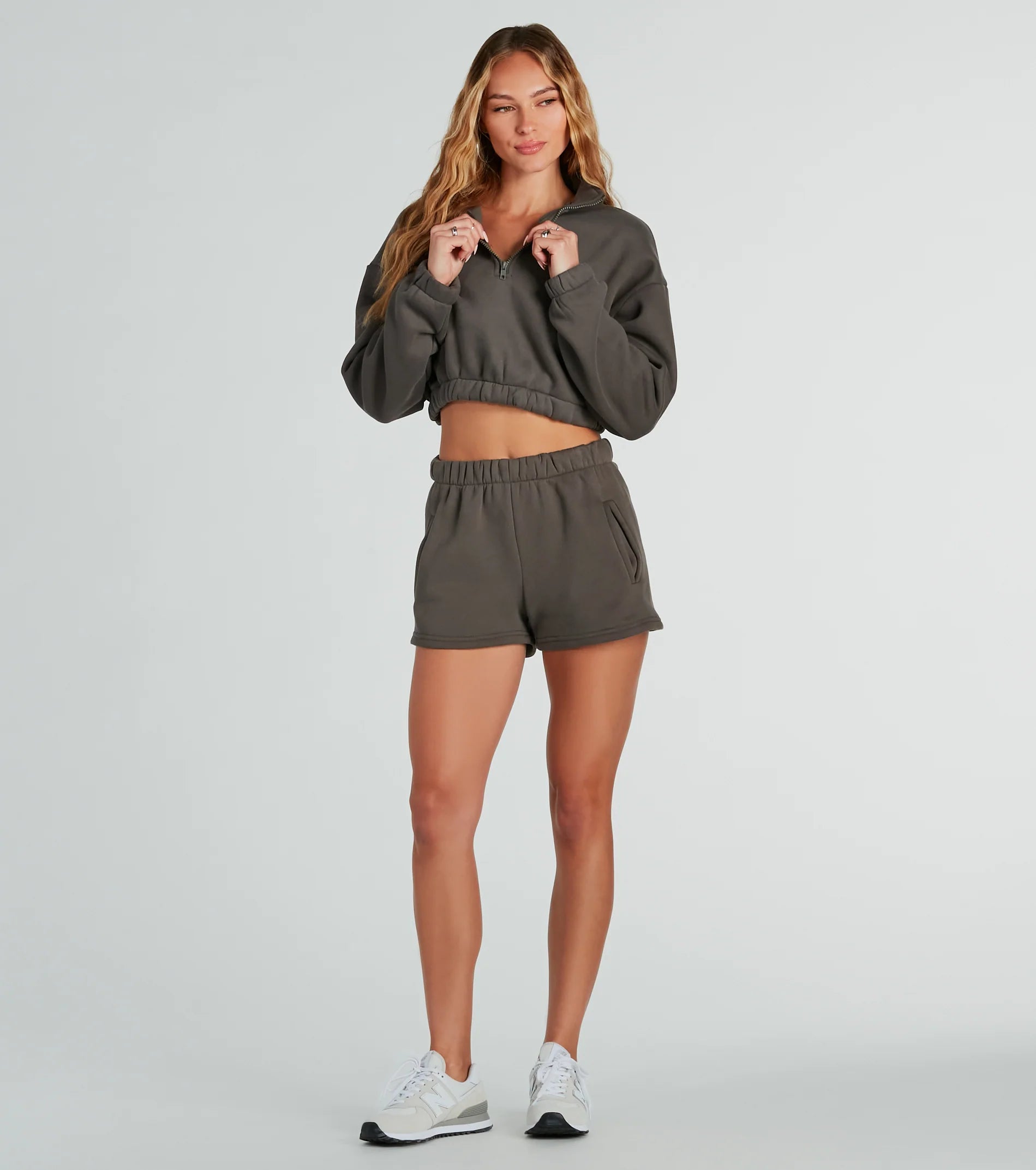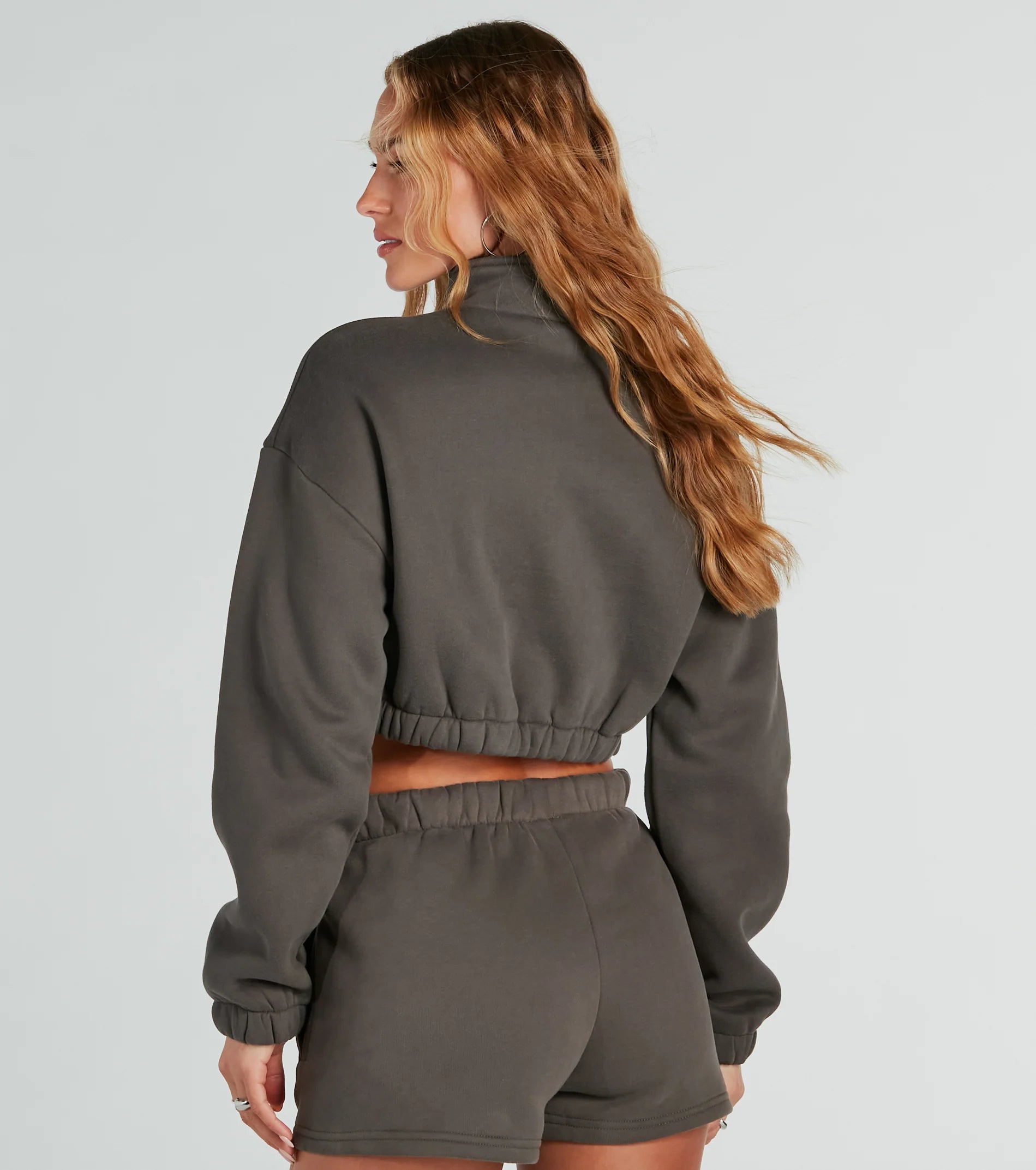 Get ready for chill vibes in this cozy crop sweatshirt! It features cozy long sleeves with elasticized cuffs, a mock neckline with a half zip closure, an elasticized cropped hem, and a warm fleece lining. Complete the look with the trendy matching shorts for lounging or running errands!
