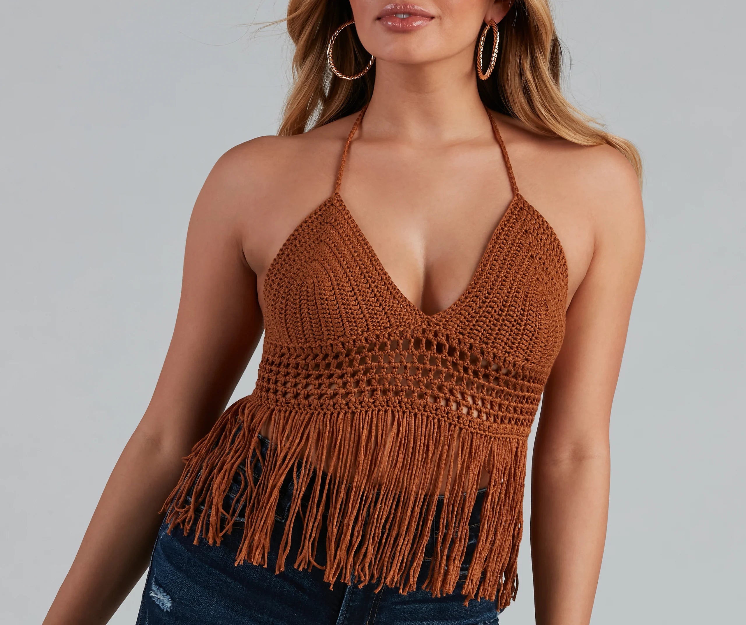 Channel your bohemian side with a crochet top that will have you ready for festival season! The top features a halter neck, neck ties to easily adjust, and a fringe hem. The top is composed of an unlined crochet knit fabric that offers a relaxed fit with minimal stretch. Complete look with cutoff shorts.