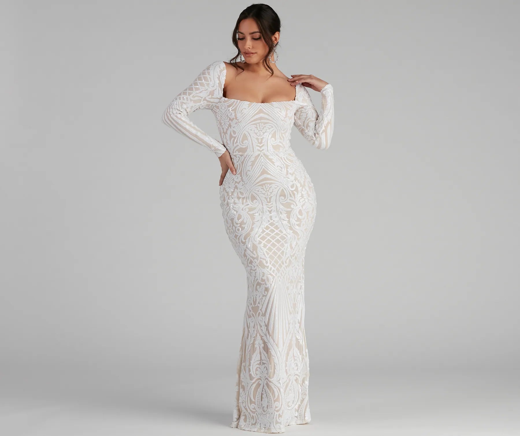 Make them all stop and stare with a stunning formal dress that exudes elegance. Yesenia features a bold square neckline, long fitted sleeves, a damask sequin pattern, and a curve-hugging mermaid silhouette. Complete your formal outfit with rhinestone earrings and glitter heels.