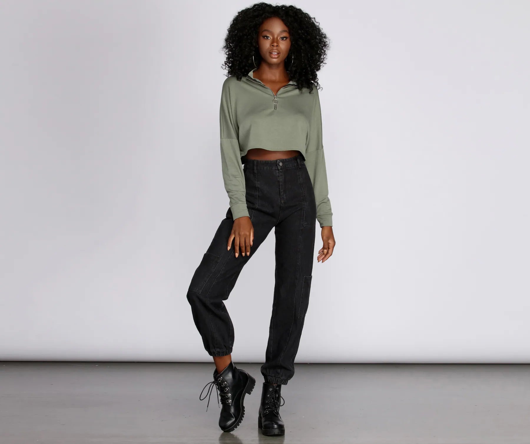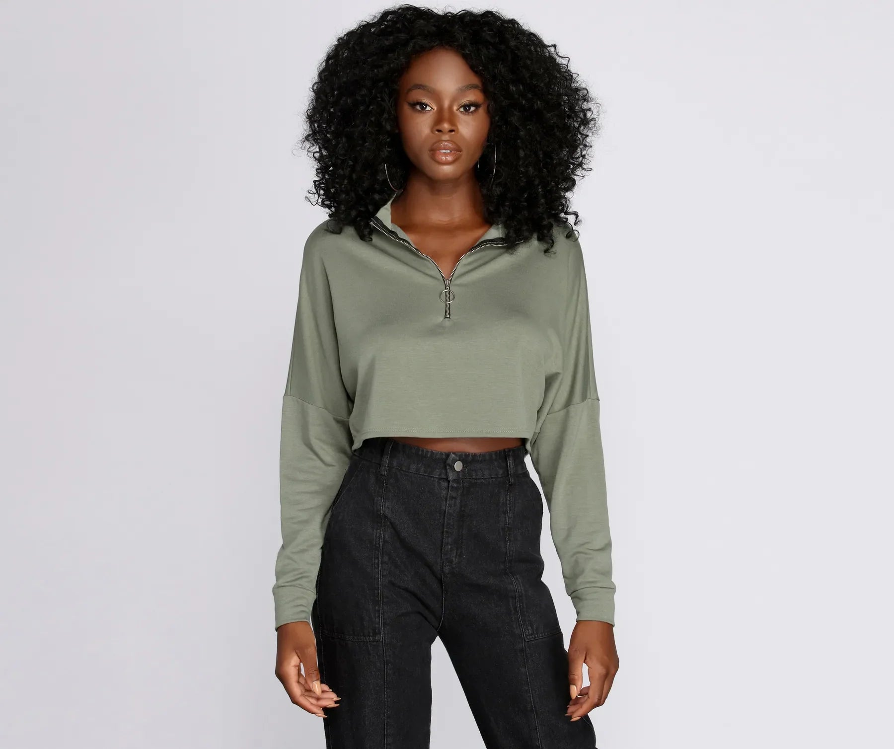Keep it chill and casual in this lightweight pullover! It features long sleeves, and a hem that is cropped and hits mid torso. Pullover has a mock neckline, and a half zip up detail with an O-ring.