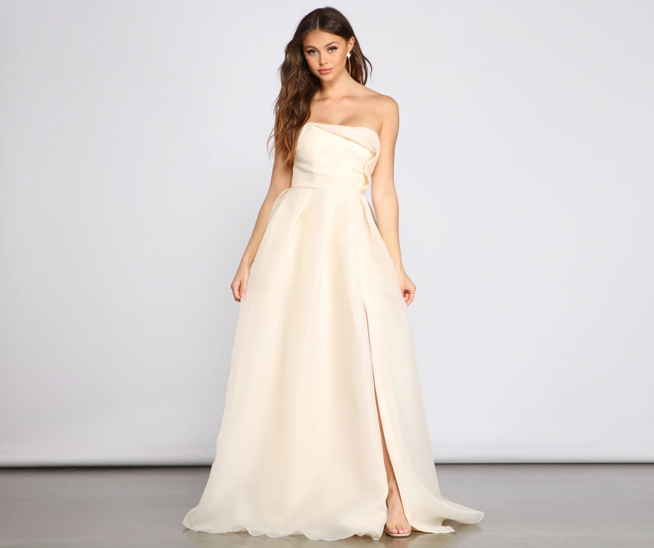 Mesmerize them all with a formal dress that wows! Zora features a sleeveless square neckline, a ruffled accent at the bodice, a voluminous A-line silhouette with a high side slit. The dress is composed of a woven satin fabric that offers a form hugging fit with minimal stretch. Complete look with rhinestone heels.